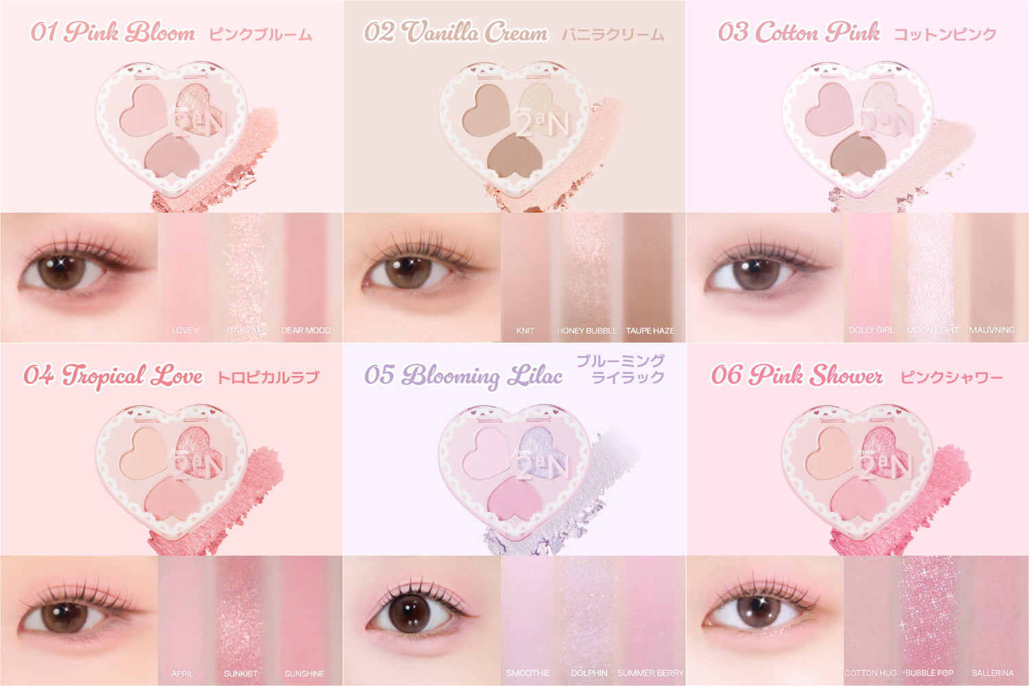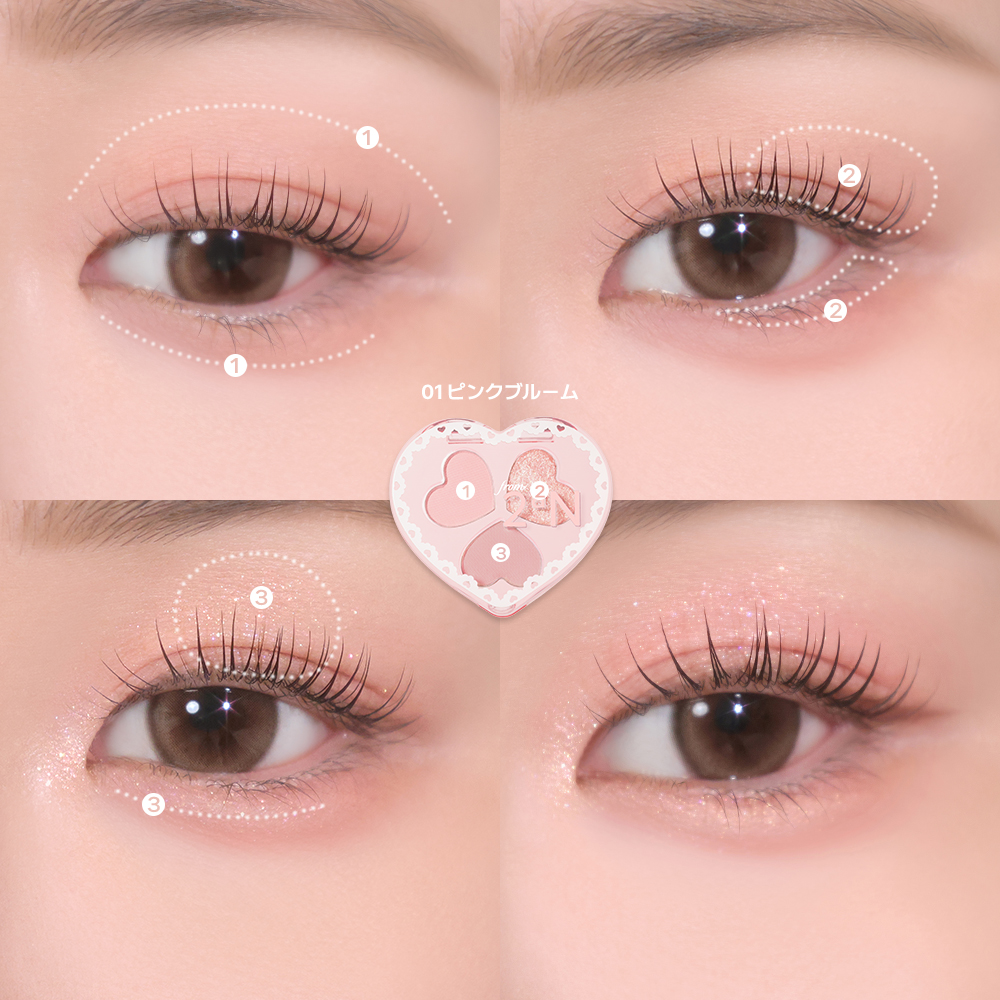 3色でベースと、陰影、ポイントのアイメイクを作り上げるミニアイパレットの“ラブクローバーパレット”は、高密着テクスチャーでよれにくく、デーリー使いに便利な設計とした。既存製品の“ベターミーアイパレット”のベース、陰影、ポイントを一つのパレットにまとめた。カラーバリエーションは01ピンクブルーム、02バニラクリーム、03コットンピンク、04トロピカルラブ、05ブルーミングライラック、06ピンクシャワーの全6種をそろえた。