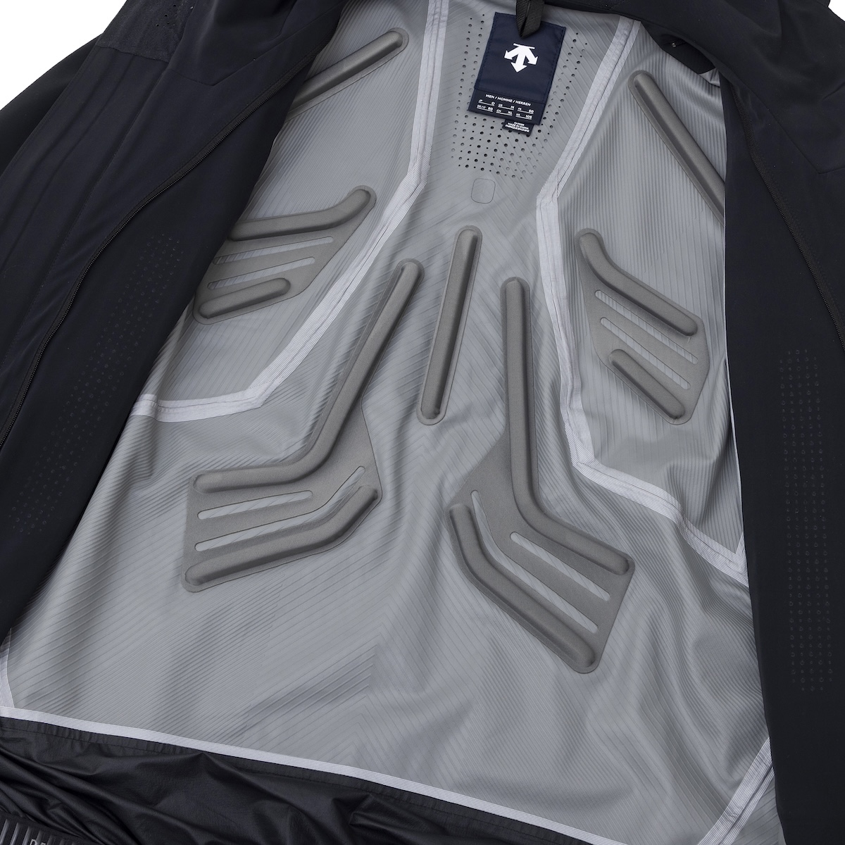 “エアロストリーム スキーマテック スキー 3in1ジャケット”はハードシェルジャケットとミドルレイヤージャケットに分かれている。ハードシェルジャケットは、選手らの寒暖差による蒸れの課題に応えるため、背中部分にクッション性のある突起物を配置し空気の循環を促進する換気機能を搭載したエアロストリーム技術を採用した。この技術は大阪・茨木市にある研究開発拠点「DESCENTE INNOVATION STUDIO COMPLEX(DISC)OSAKA」で開発したものだ。ミドルレイヤージャケットはスマートパディング機能を搭載し、最も温かさを必要とする部分に中綿を配置し、温かさと蒸れを同時に解消する設計が特徴だ。