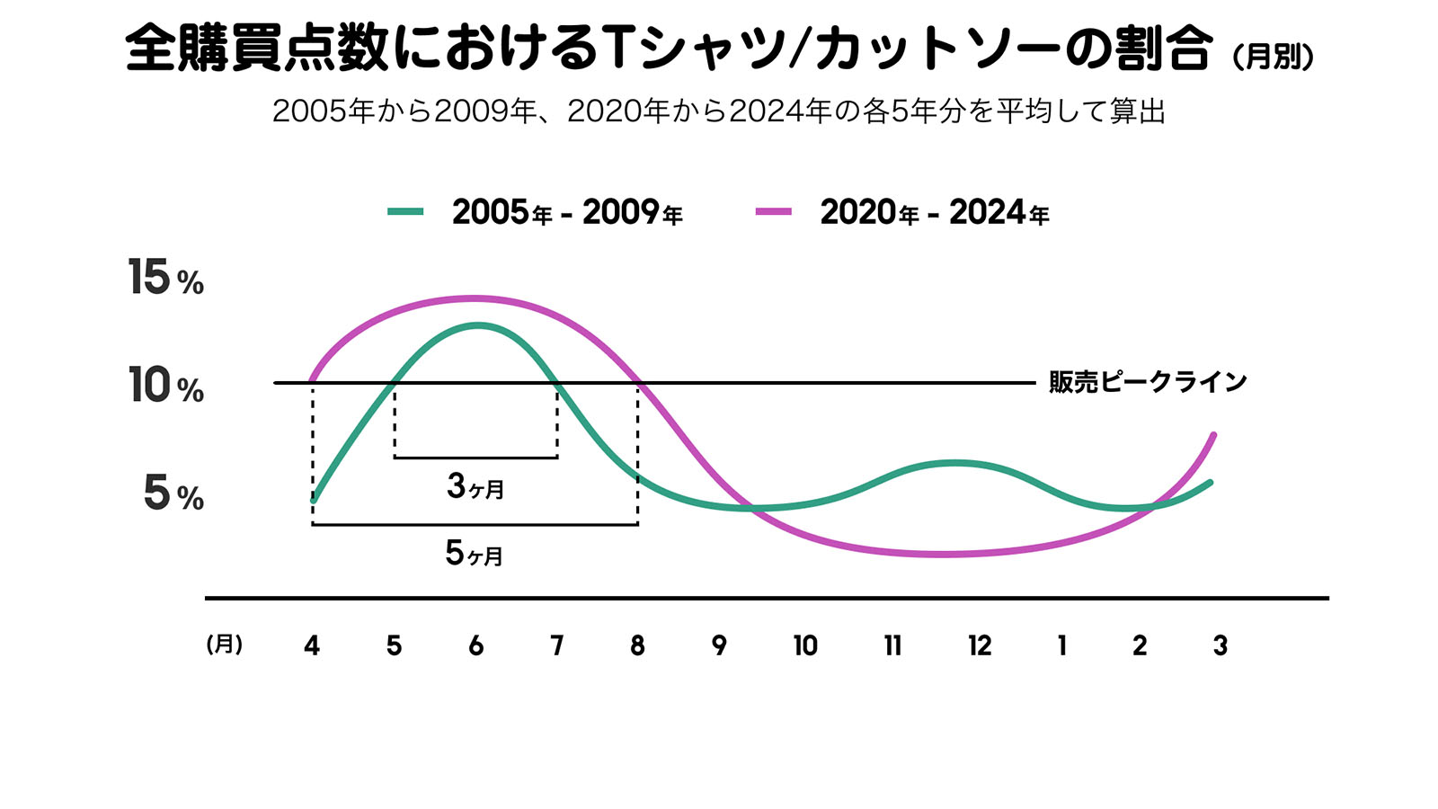 気象庁が示す平均気温上昇に合わせるように、Tシャツの販売ピークは、2000年代前半に「5〜7月」だったのが、現在は「4〜8月」に拡大した。「シーズンレス化」が顕著に現れた形だ。一方アウターは、ピークが「10〜1月」→「11〜1月」へ短縮。冬の到来が後ろ倒しになっている現実を購買データが証明した。