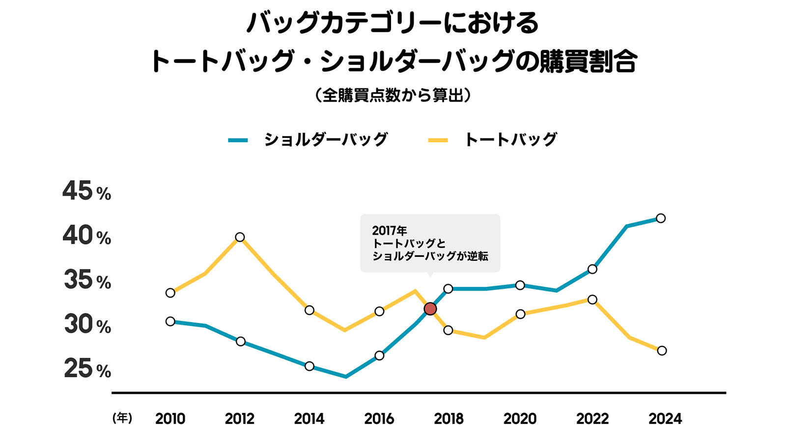 バッグカテゴリでも象徴的な変化が。10年代以降、トートバッグは約15ポイント減少した一方、ショルダーバッグは約20ポイントも増加した。スマホ時代の行動変化を体現するように、“両手が空く”スタイルが主流に。一方、靴もスニーカー&サンダルはこの20年間で約30ポイントも増加。コロナ禍以降は通勤のカジュアル化が急進し、リカバリーサンダルの台頭も後押しした。