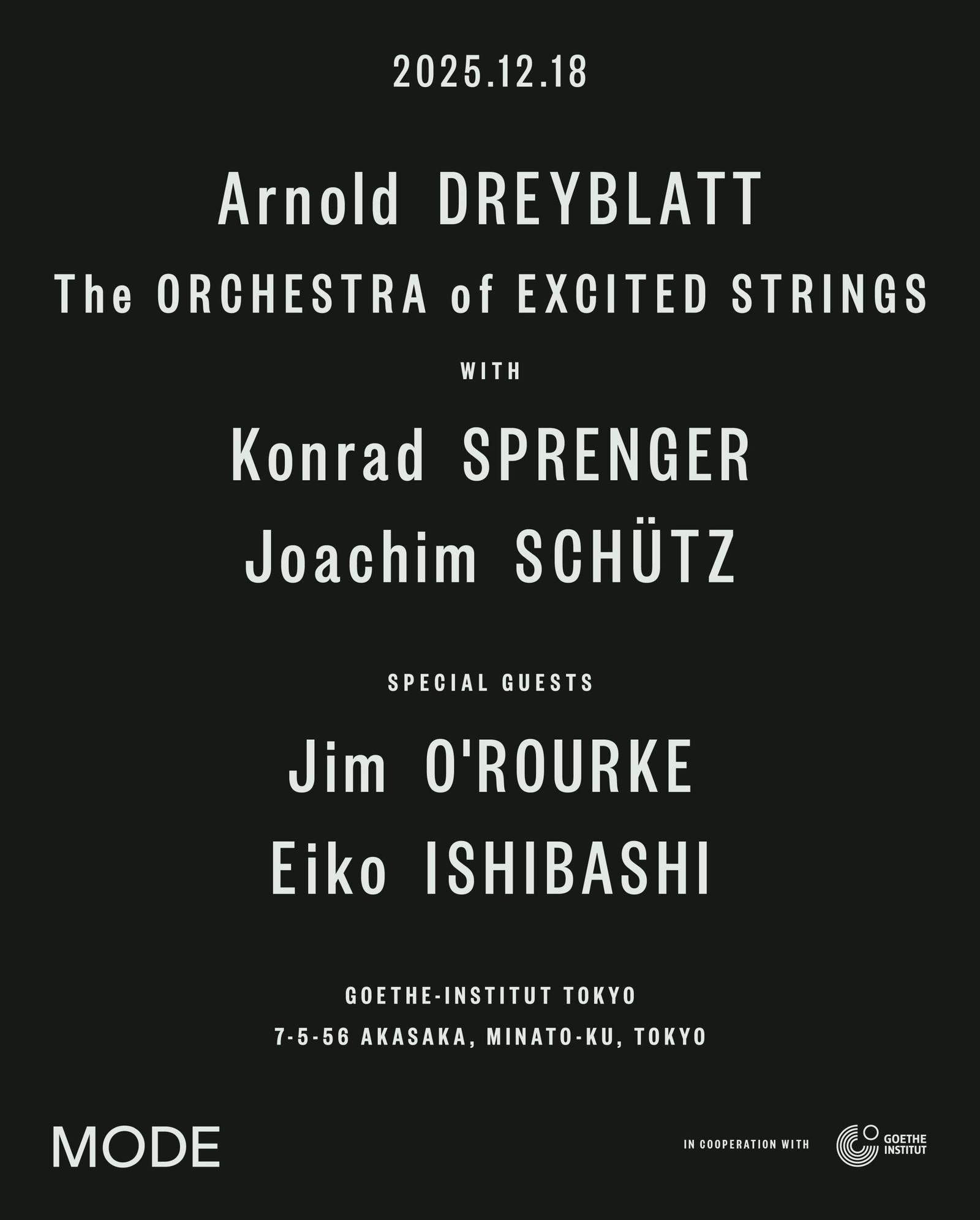 実験音楽やオーディオビジュアル、パフォーミングアーツを紹介するプラットフォーム「MODE」は、12月18日に東京・赤坂のゲーテ・インスティトゥート東京でアーノルド・ドレイブラット(Arnold Dreyblatt)によるアンサンブル・プロジェクト「ジ・オーケストラ・オブ・エキサイテッド・ストリングス(The Orchestra of Excited Strings)」を開催する。
