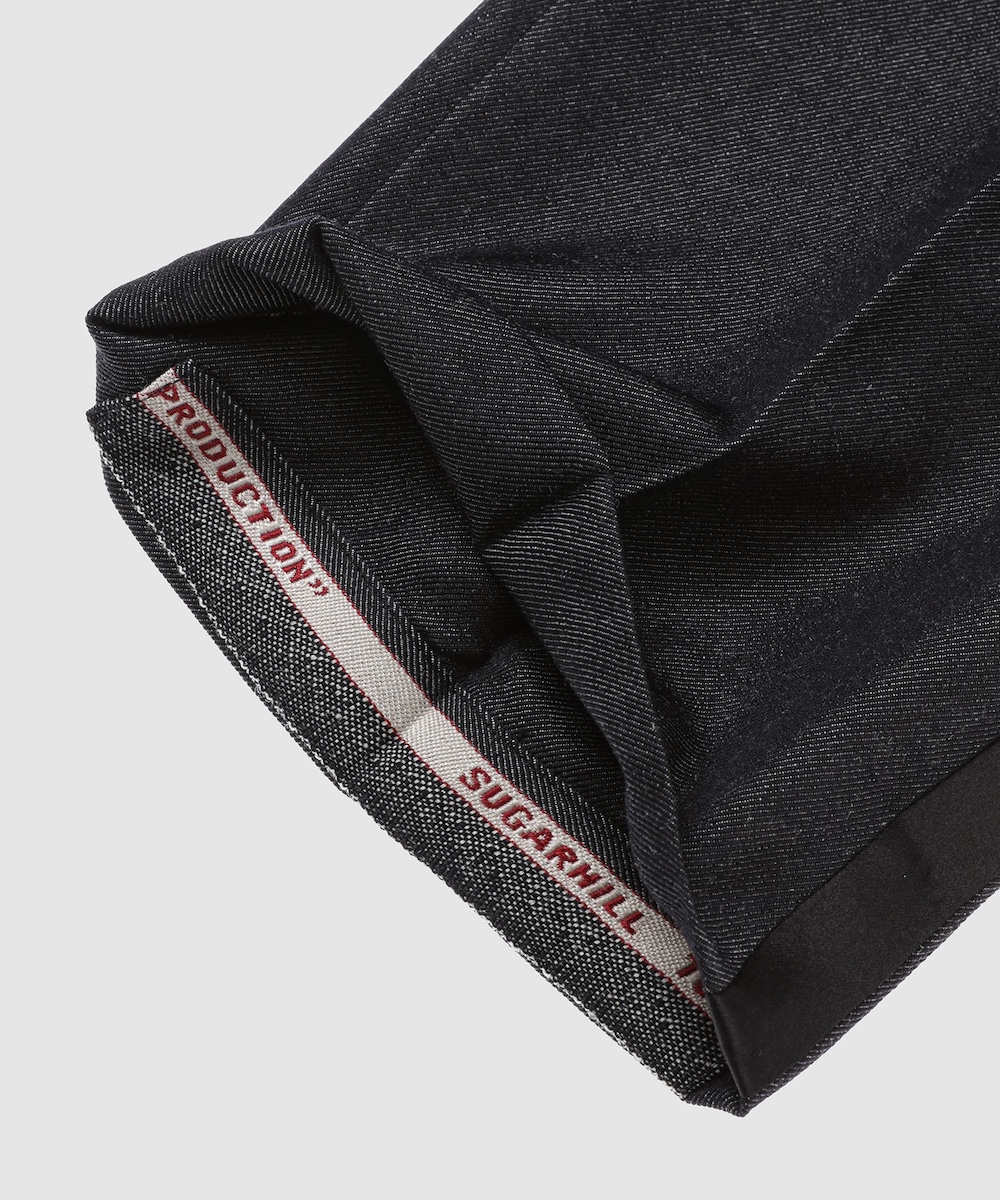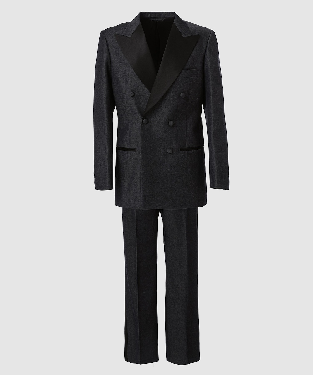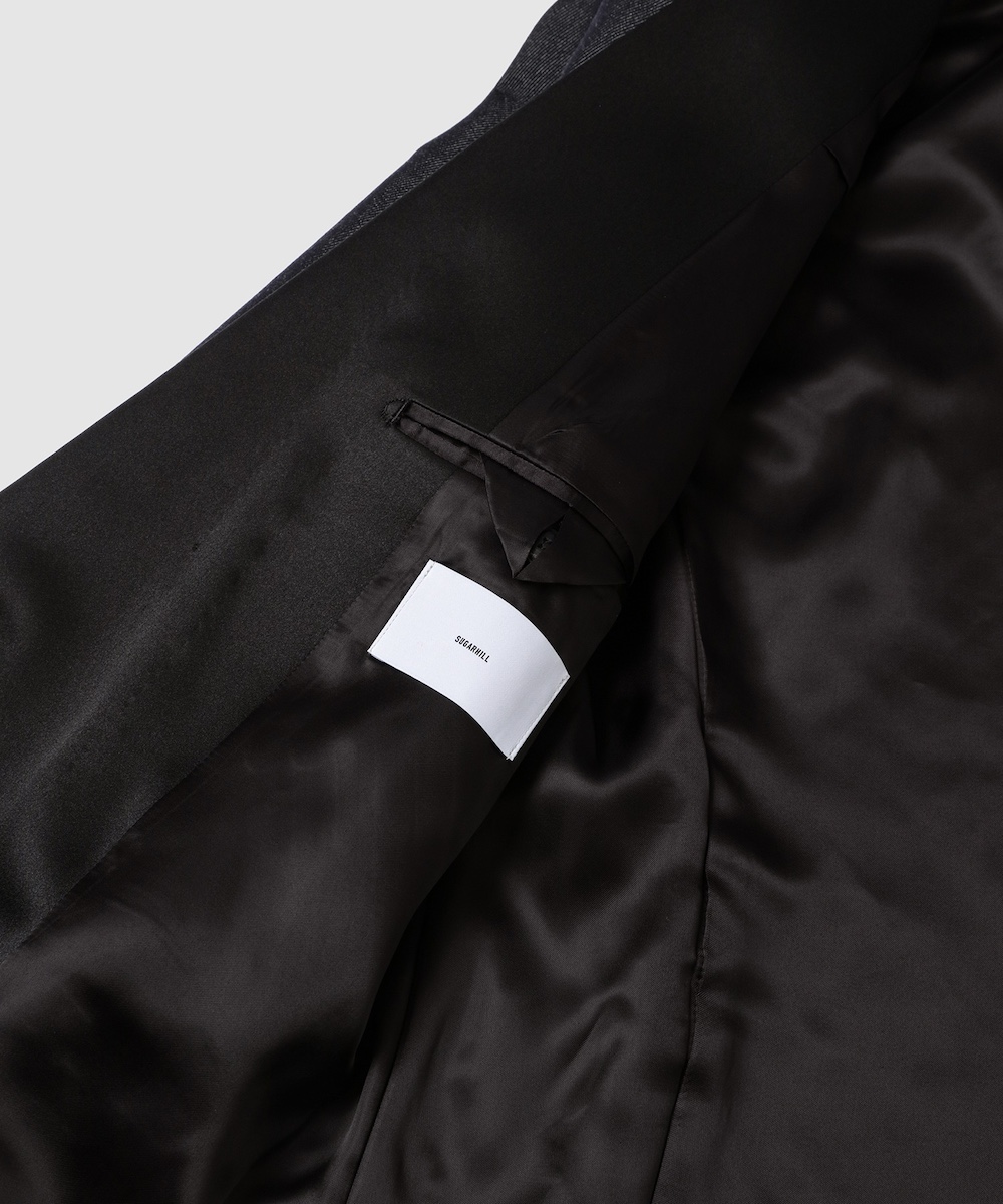 同アイテムは、独自に開発した特製ウールサージを表地に採用し、「シュガーヒル」オリジナルのデニム生地を基にした染色と織りでデニムの風合いを表現。ラペルや側章にはシルク100%のダブルサテンを使用し、深みのある黒と上質な光沢、しなやかなドレープがタキシード全体を華やかに引き立てている。伝統的なテーラリングを踏襲したクラシックなスタイルに、「シュガーヒル」の特徴でもあるミリタリーやワークに通じる武骨さを融合し、素材本来の魅力を最大限に引き出した1着となっている。