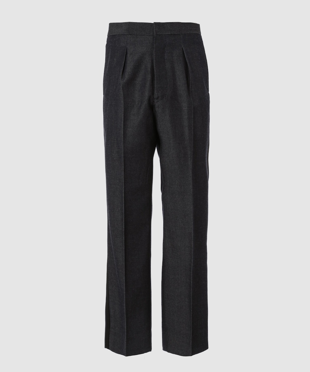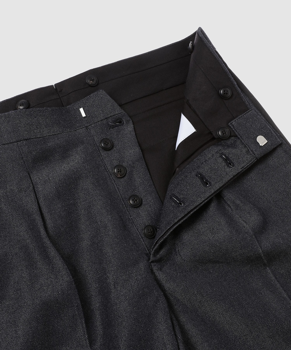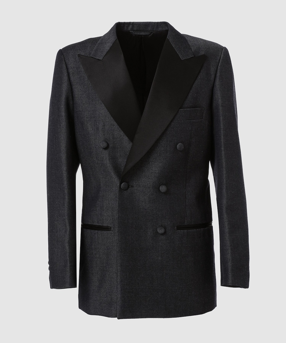 同アイテムは、独自に開発した特製ウールサージを表地に採用し、「シュガーヒル」オリジナルのデニム生地を基にした染色と織りでデニムの風合いを表現。ラペルや側章にはシルク100%のダブルサテンを使用し、深みのある黒と上質な光沢、しなやかなドレープがタキシード全体を華やかに引き立てている。伝統的なテーラリングを踏襲したクラシックなスタイルに、「シュガーヒル」の特徴でもあるミリタリーやワークに通じる武骨さを融合し、素材本来の魅力を最大限に引き出した1着となっている。