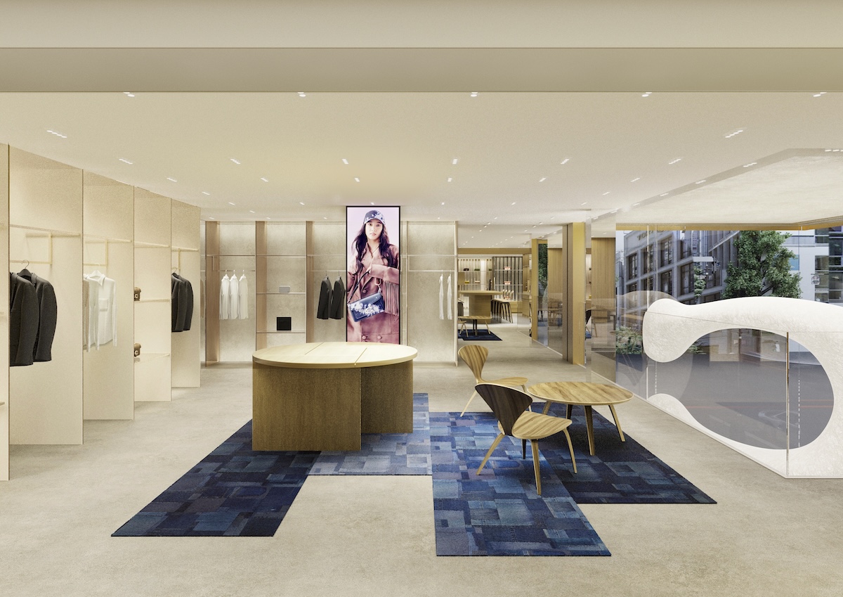 リニューアルした同店の象徴となるのは、広々とした角のウィンドウに吊るされたダイナミックなC型のスカルプチャーだ。ファサードには、ニューヨークのスカイラインをイメージした縦方向のルーバーを配置し、見る角度によって印象が変わるリズムと動きを演出する。