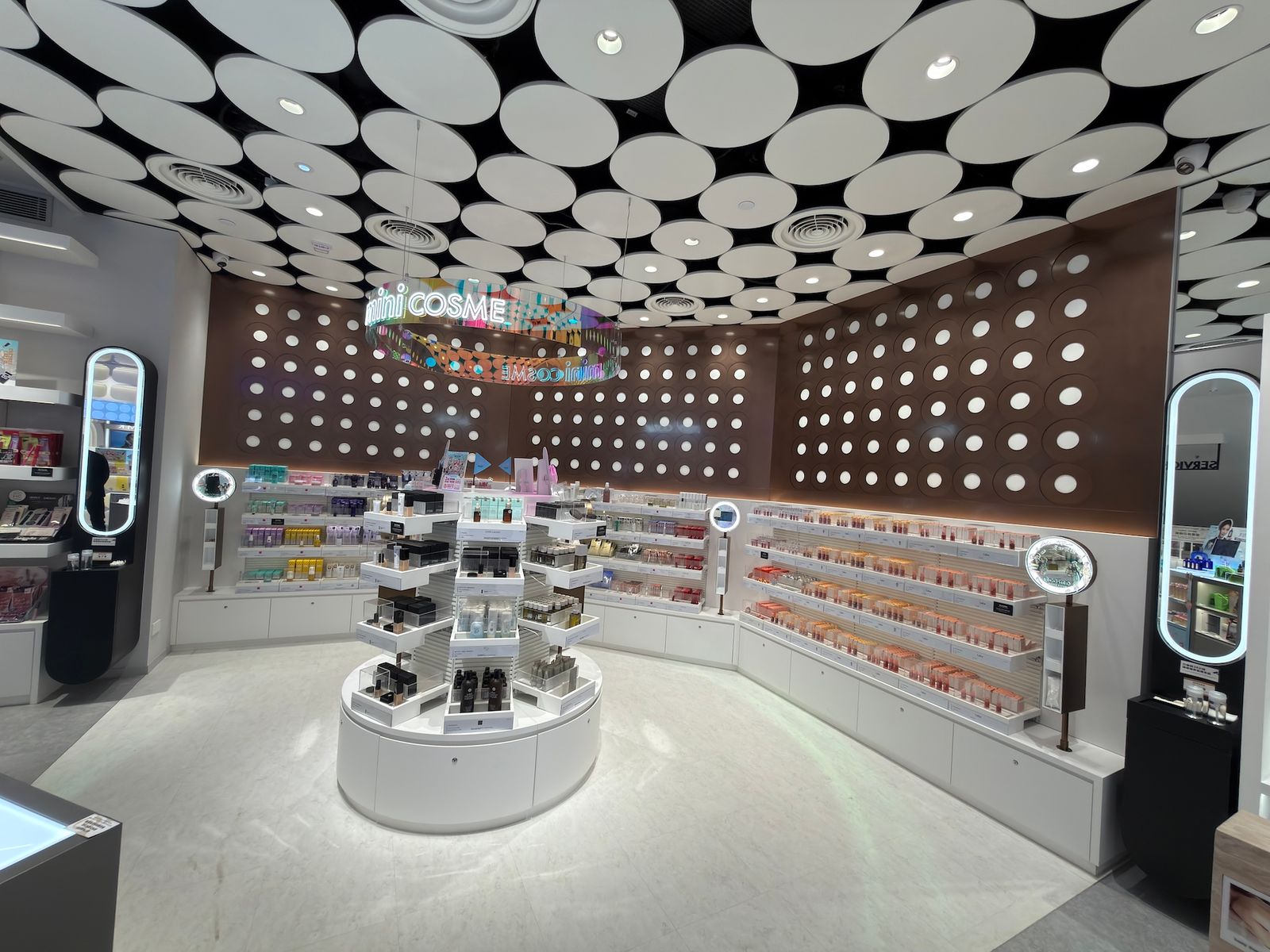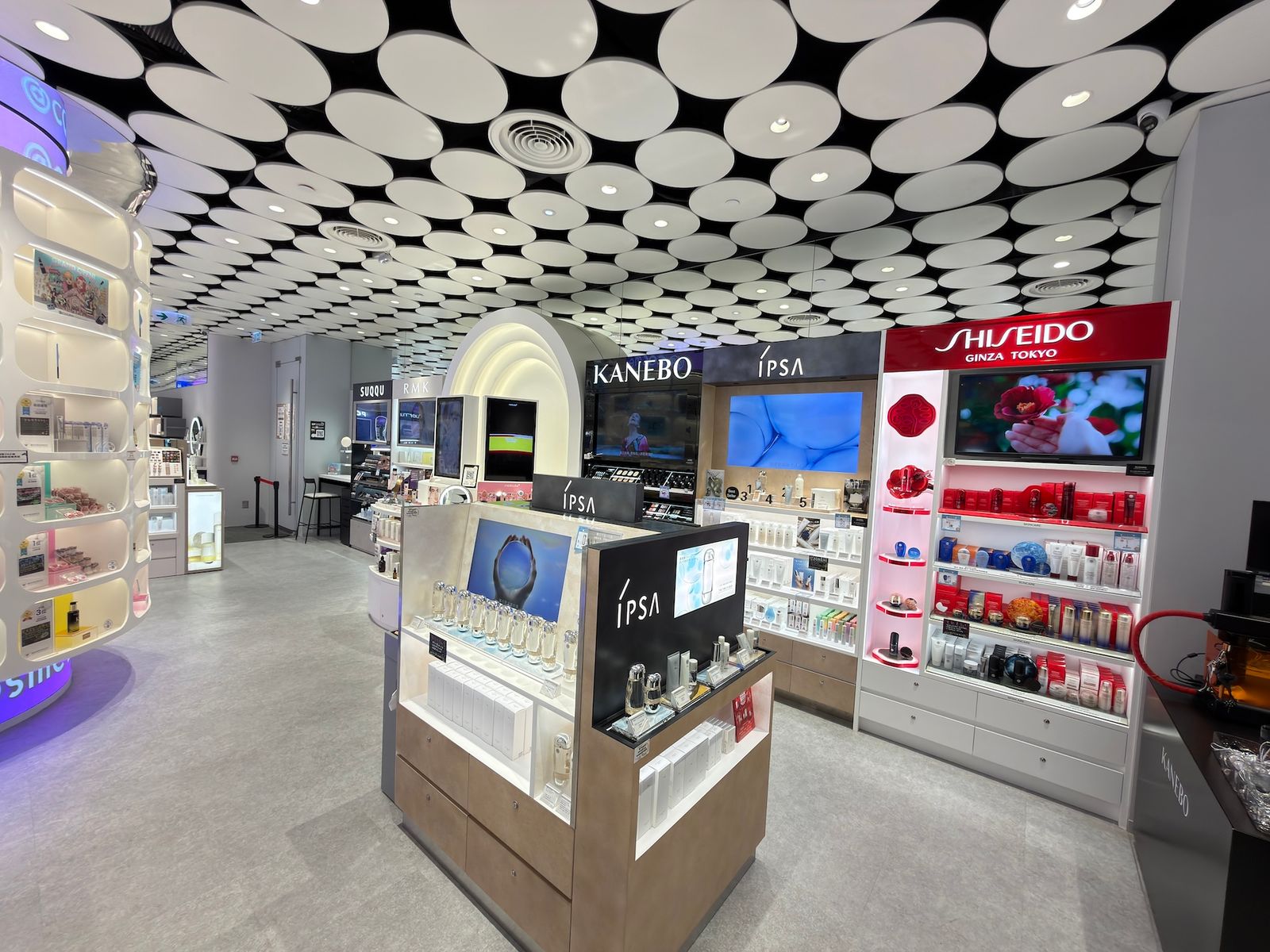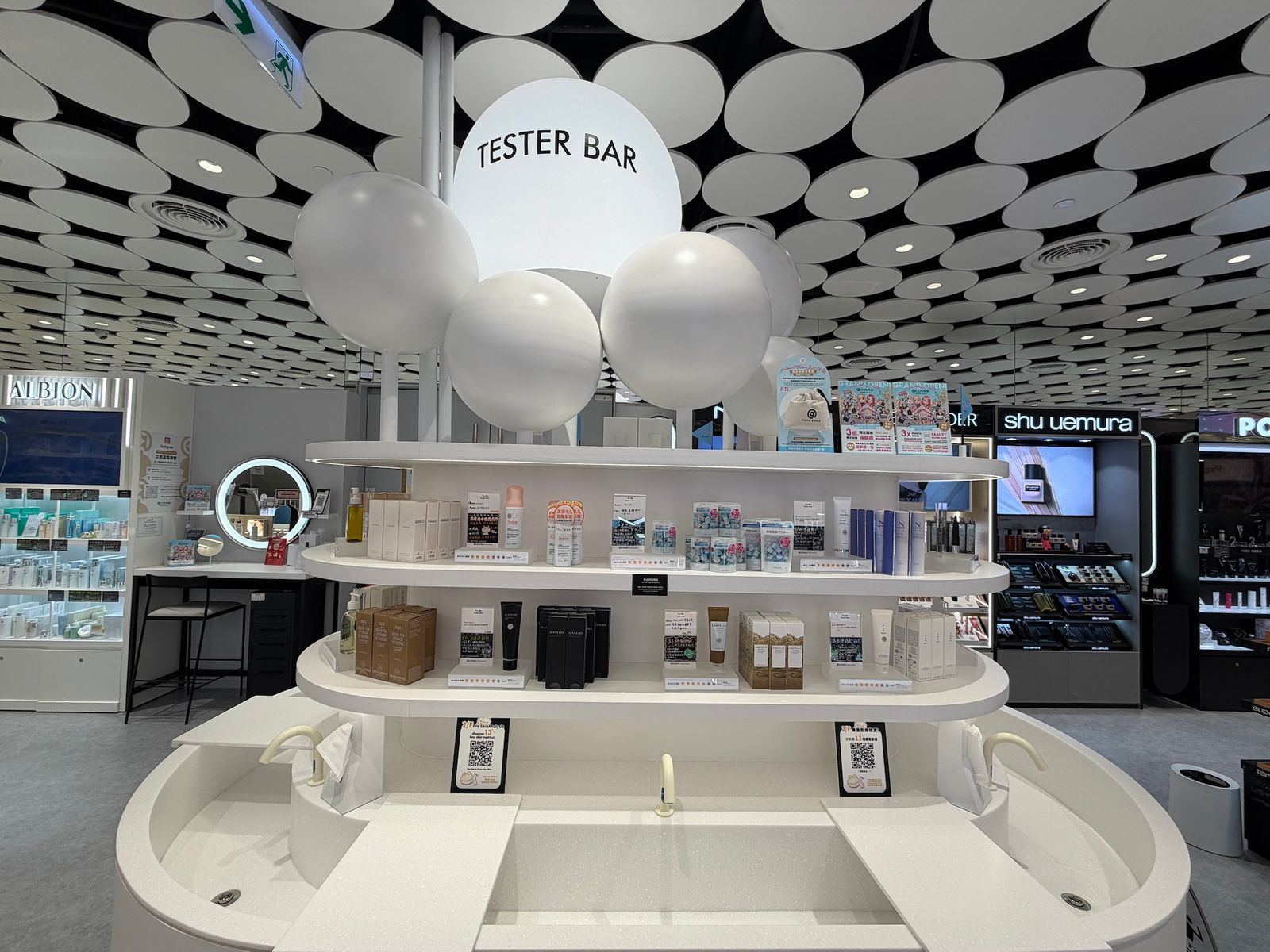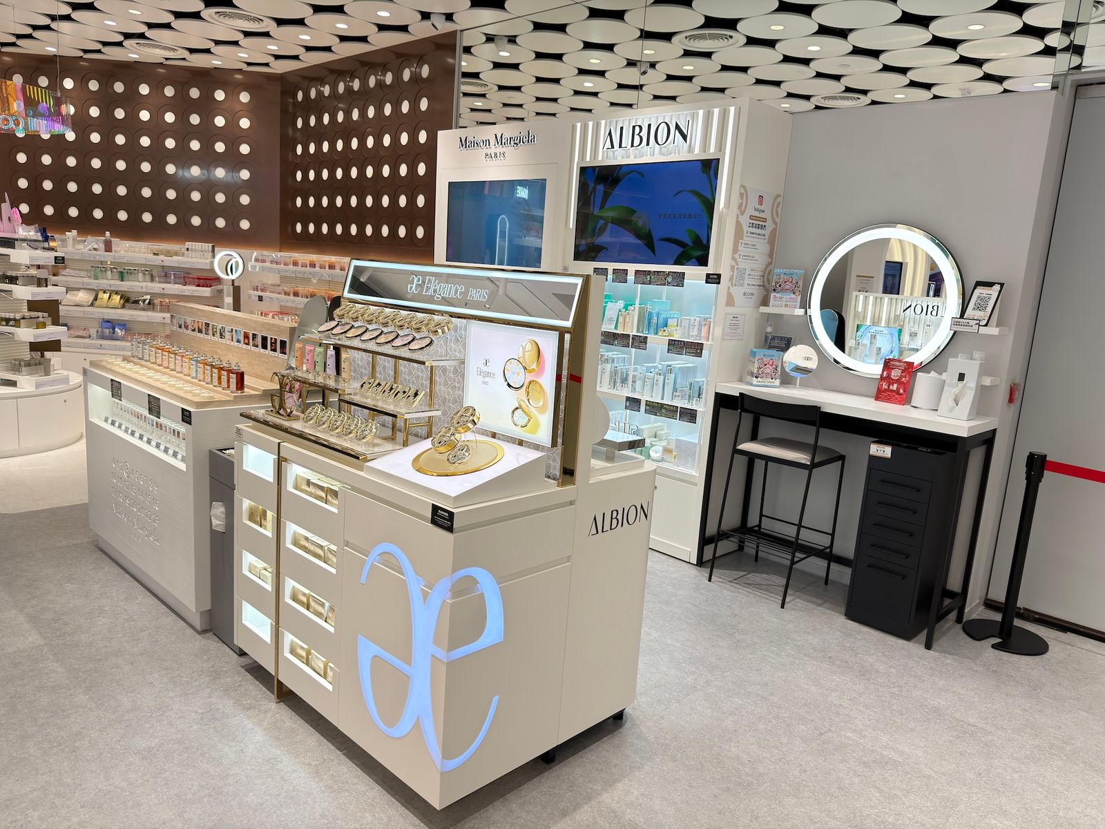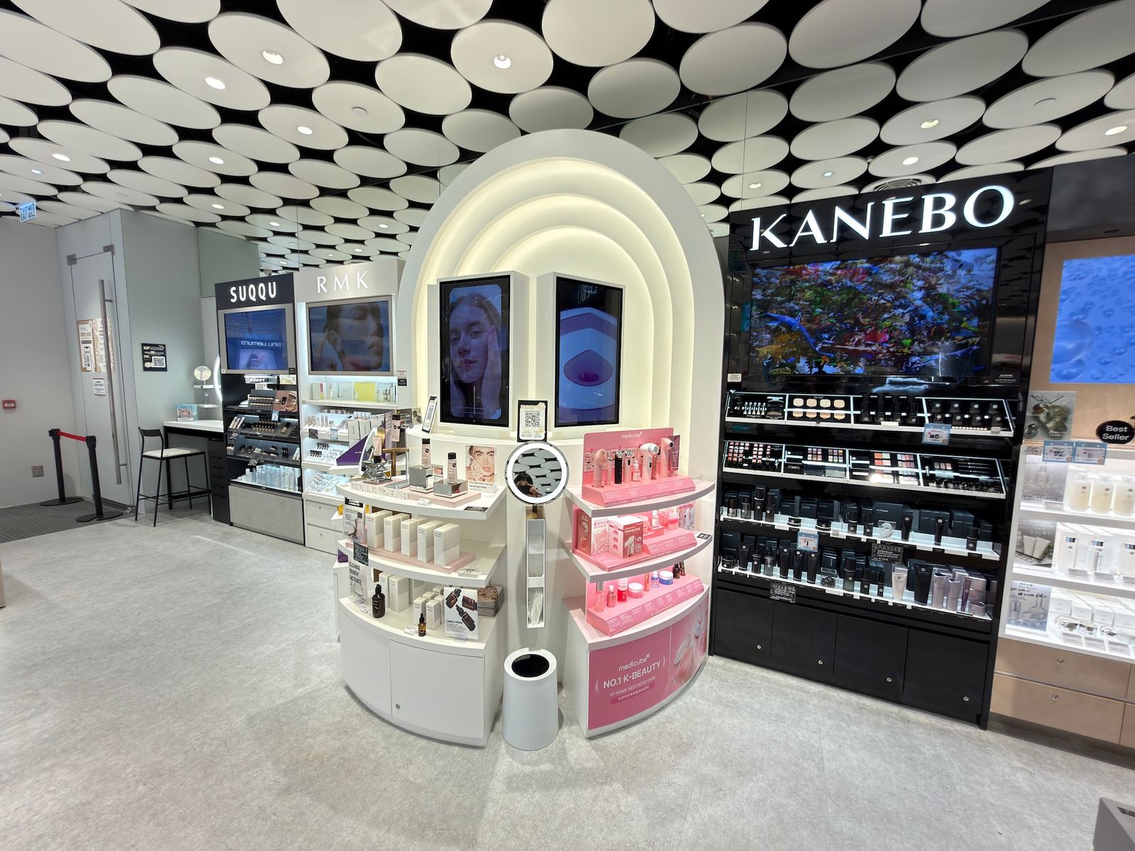 入口右横の通りに面したスペースにはポップアップエリアを設置し、オープン時は「カネボウ」、翌週は「メディキューブ」と日本の旗艦店と同様に1〜2週間単位でブランドを入れ替えて運用する。
