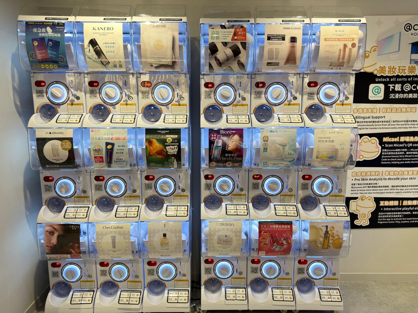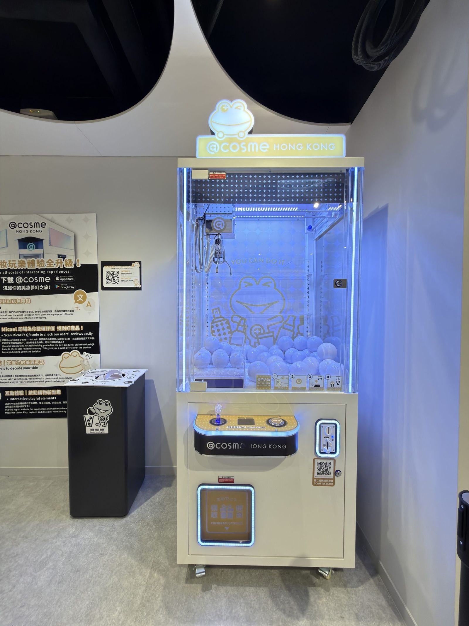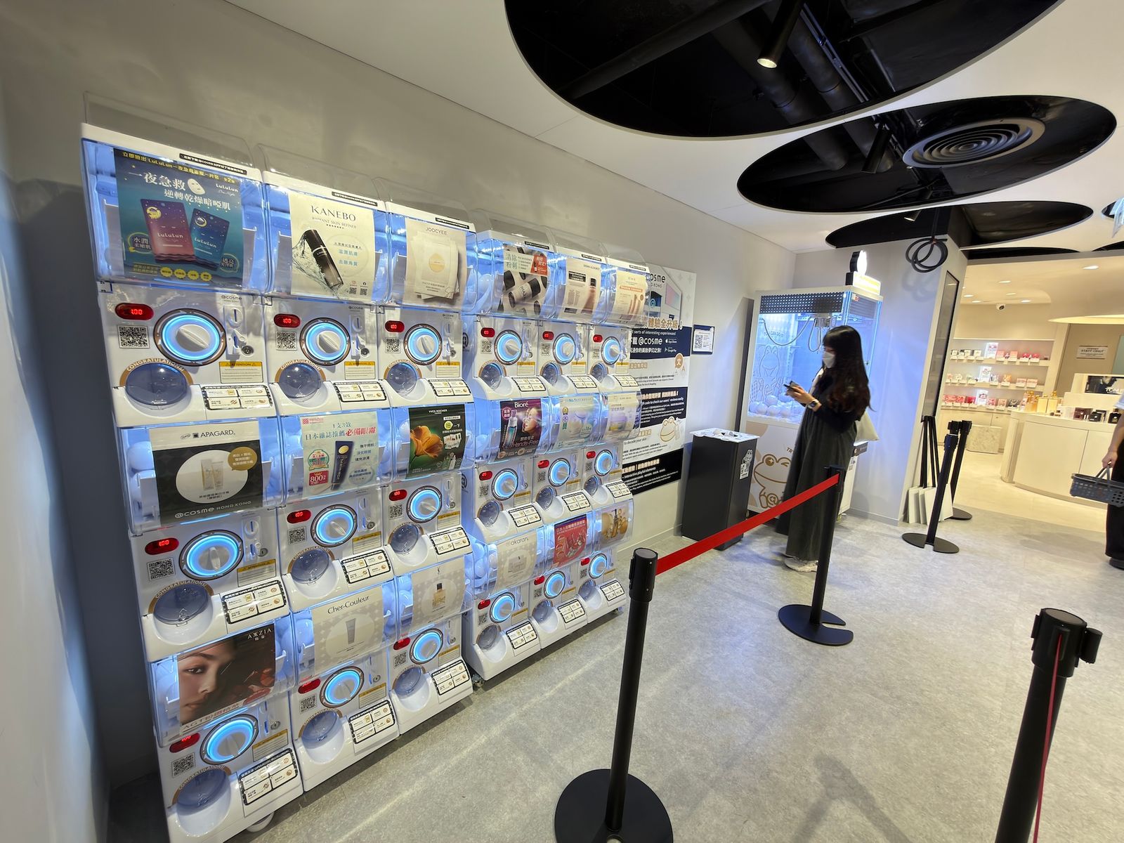 隣接エリアには、メーカーに依存しない肌測定器を設置し、13項目を測定した結果をアプリに蓄積できる仕組みを構築した。「シートマスクウォール」も用意し、箱売りが一般的な香港市場において、1枚単位で購入できる新しい体験を提供する。体験価値を高める施策として、500香港ドル、800香港ドル以上の購入者を対象に回せるガチャやUFOキャッチャーも設置した。