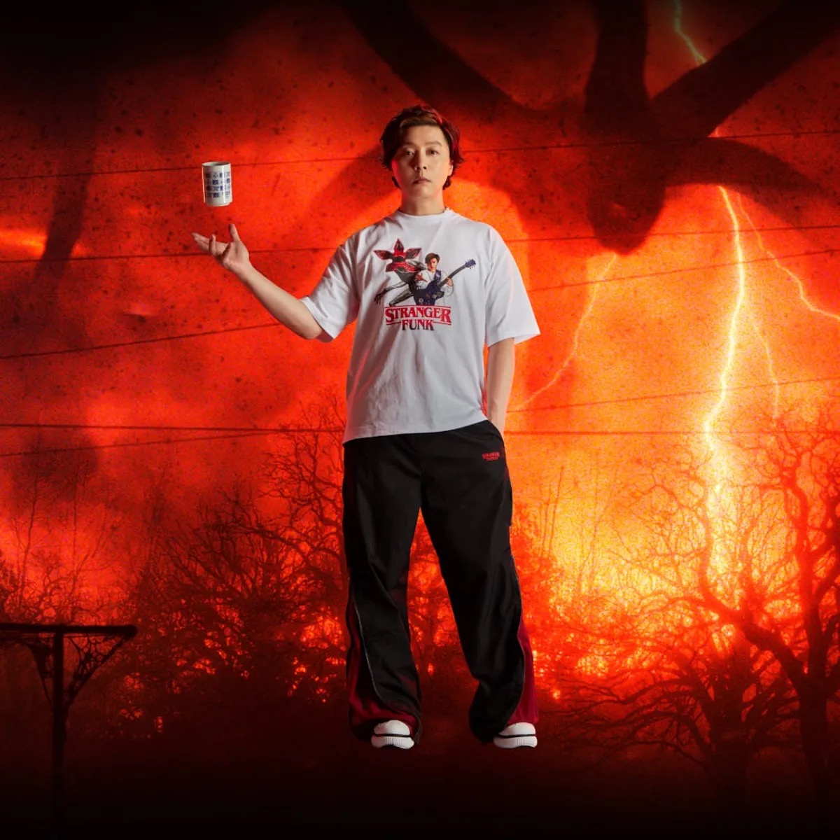 今回のコラボでは、同作の熱狂的なファンである堂本の「ストレンジャー・シングス」への“いきすぎた愛”をテーマにアイテムを製作。作中の名シーンやキャラクターをモチーフにデザインし、特別感と日常使いを兼ね備えたアイテムをラインアップ。アウターやTシャツ、セットアップといった定番のアイテムから、湯飲みや風呂敷など日本らしいアイテムまで幅広く展開する。