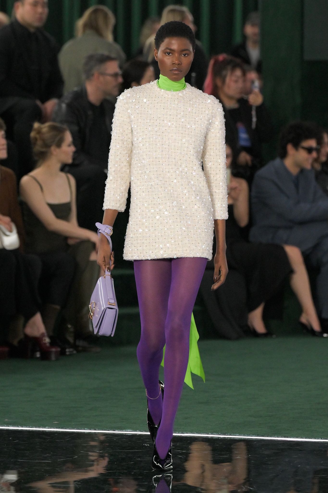 「グッチ(GUCCI)」は、パープルタイツをボトムスのように活用しました。エクリュのミニ丈ワンピースと組み合わせることで、スタイリング全体をコンパクトに引き締めました。くっきりとしたカラーコントラストが動きを生み出しています。アウターを羽織っても隠れないタイツは、冬の着こなしに仕掛けをもたらす存在。今回は、有力ブランドのランウエイから、技ありのスタイリングを読み解きます。