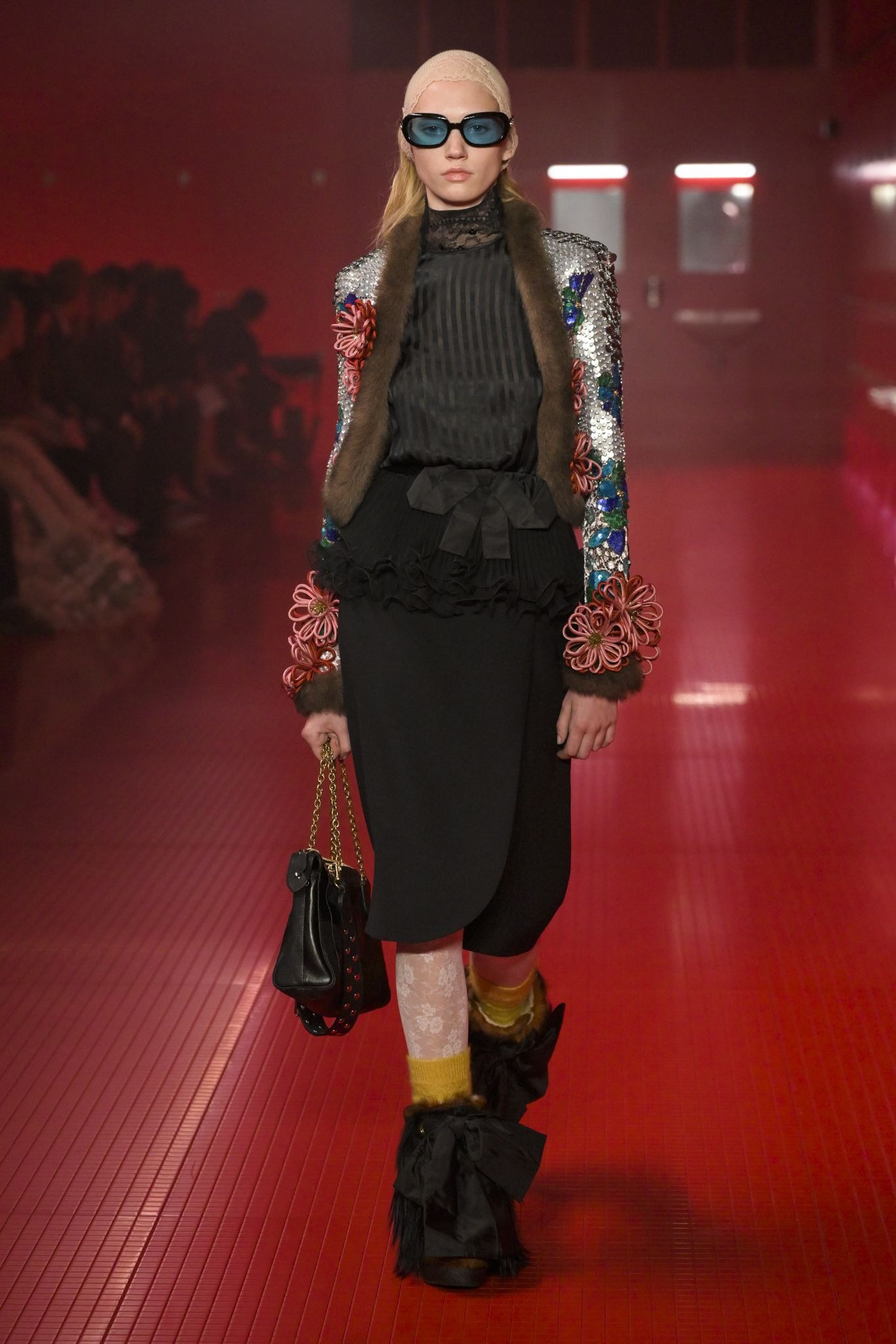 「ヴァレンティノ(VALENTINO)」は、まばゆいメタリック刺しゅうを施したジャケットを装いの主役に据えました。その他のアイテムは黒でシックにまとめながら、レッグラインには白の柄入りレースタイツにイエローのソックスをレイヤード。ガーリーな要素を加えつつ、ファーブーツで華やかさも添えています。ゴージャス、ノーブル、カジュアル、コケットといったテイストをミックスした、シャッフル感のあるコーディネートです。