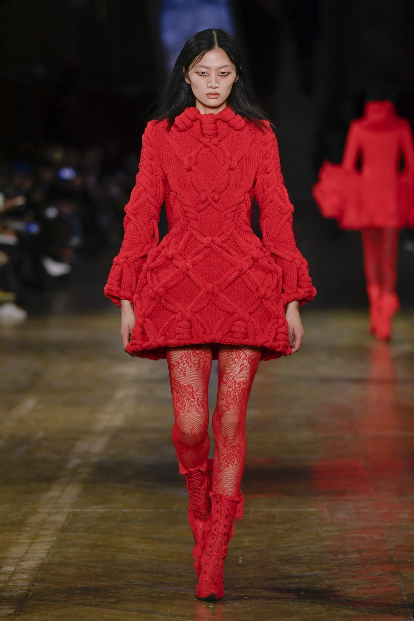 「マックイーン(MCQUEEN)」は、全身を赤で統一したルックを披露しました。ヴィヴィッドな赤のミニ丈ワンピースは、手の込んだ職人技が注ぎ込まれたクチュールテイスト。透け感のある柄入りレースタイツが、伸びやかなレッグラインを引き立てています。優美に張り出したワンピースの裾とのボリュームコントラストによって、腰から下がいっそうスレンダーに映ります。編み上げブーツとの対比も、全体の印象を引き締めました。
