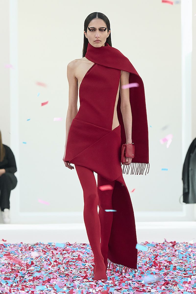 「クレージュ(COURREGES)」は、全身をワインレッドで染め上げました。全身を覆い隠すのではなく、部分的にほどよく素肌をのぞかせることで、抜け感が生まれ、ヘルシーな雰囲気に。マフラーと一体化したトップスが縦長シルエットを強調し、ボトムスにはブーツと一体化したかのようなタイツを採用。レッグラインをシャープに演出しました。
