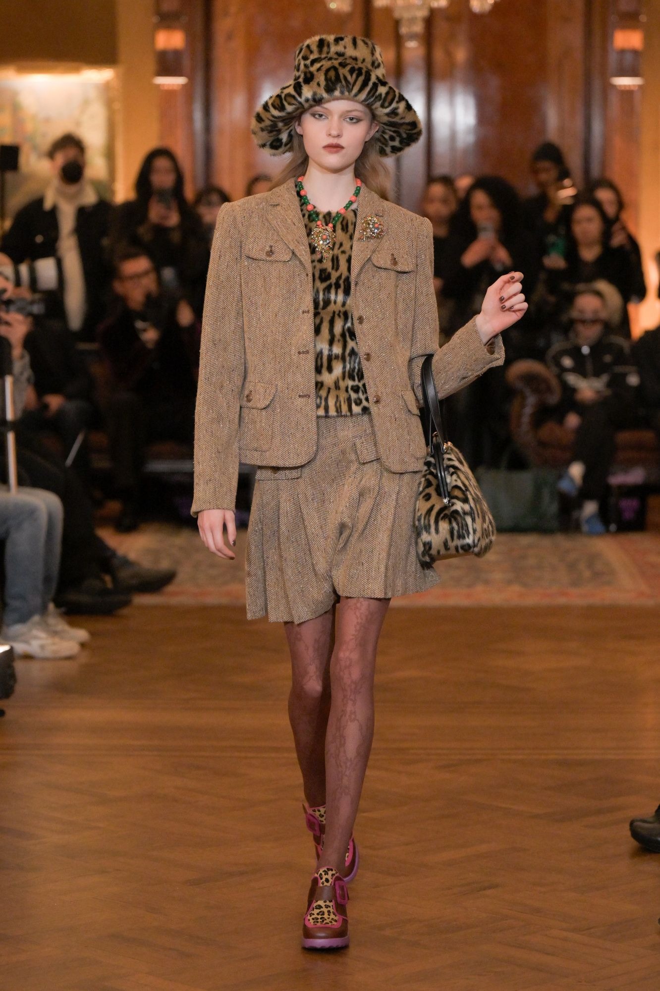 「アナ スイ(ANNA SUI)」は、ジャケットとショートボトムスによるクラシカルなセットアップを用意しました。トップスとバッグにレオパード柄を取り入れ、レディーライクな装いにスパイスを加えています。全体をブラウン系でまとめることで、柔らかなムードに。同系色のレースタイツが、足元に落ち着きを添えています。