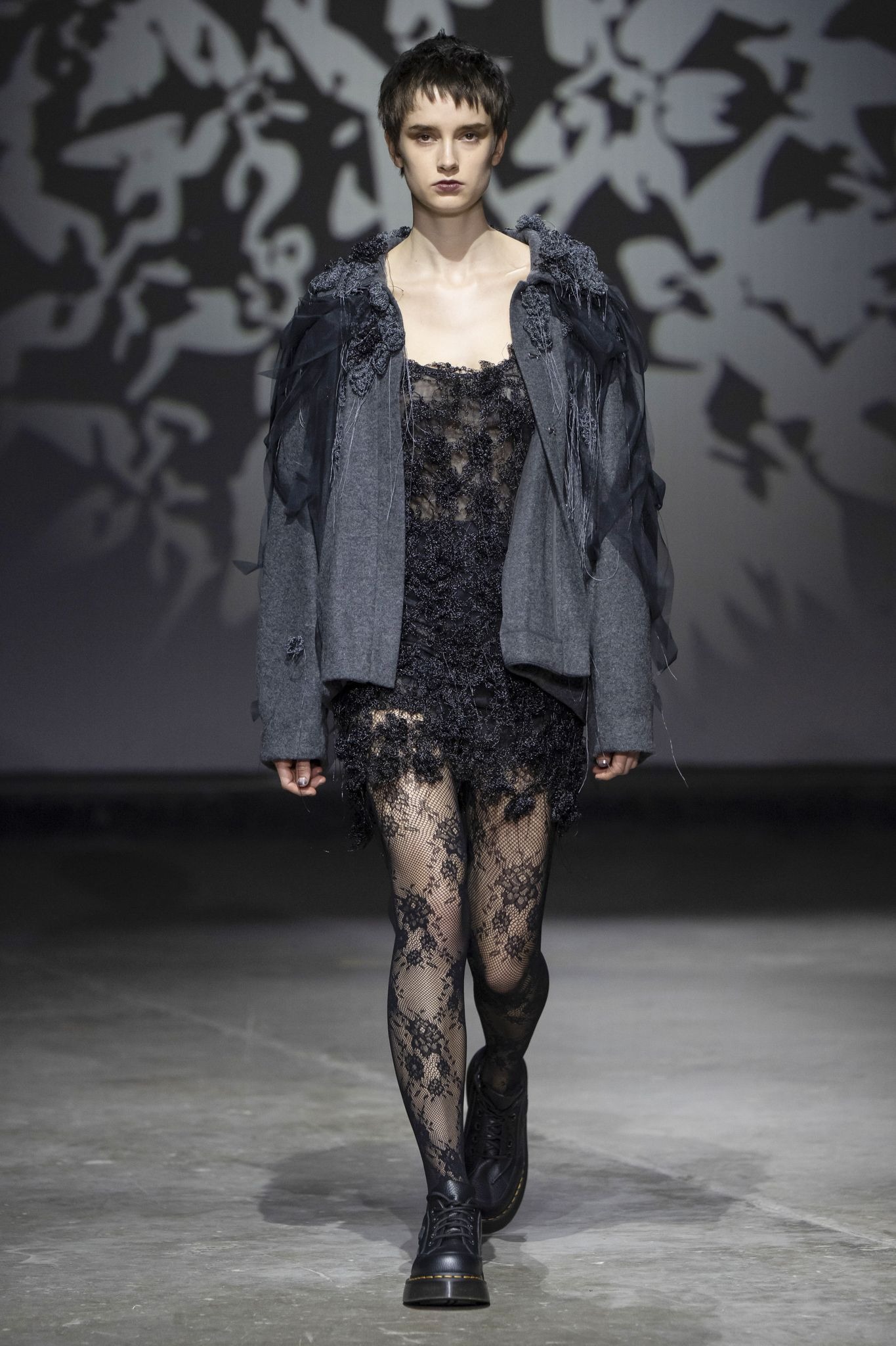 「ポーリーン デュジャンクール(PAULINE DUJANCOURT)」は、黒を基調に、デカダンでアンニュイなムードを演出しました。黒ニットのワンピースに黒のレース編みタイツを合わせ、パンキッシュな空気を漂わせています。デコラティブなカーディガンをゆるりと羽織ることで、リラックス感をプラス。カーディガンとタイツのバランスによって、攻めすぎないネオパンク調に仕上げました。