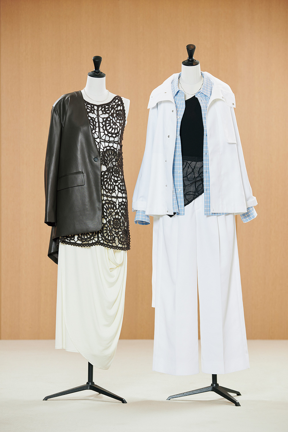 象徴的なのが、水色のギンガムチェックシャツ(トルソー右)だ。カシュクールにしてドレープを出したり、アクセサリー感覚で腰や胸に巻いたりと自由な着こなしが可能。クリーンな白のショートトレンチとグルカパンツのセットアップと合わせ、インナーにはワンショルダーニットからのぞく素肌で抜け感を出す。もう一つの目玉は、職人が約80時間をかけて編んだクロシェ編みのチュニック(同左)。生産数量は限られるものの、「お店でワクワクしていただけるエッセンス」と割り切って手間暇をかけたアートピースだ。「一歩間違えばほっこりしすぎてしまう」(坂上ディレクター)アイテムだが、レザージャケットを肩掛けして都会的なムードに仕上げた。