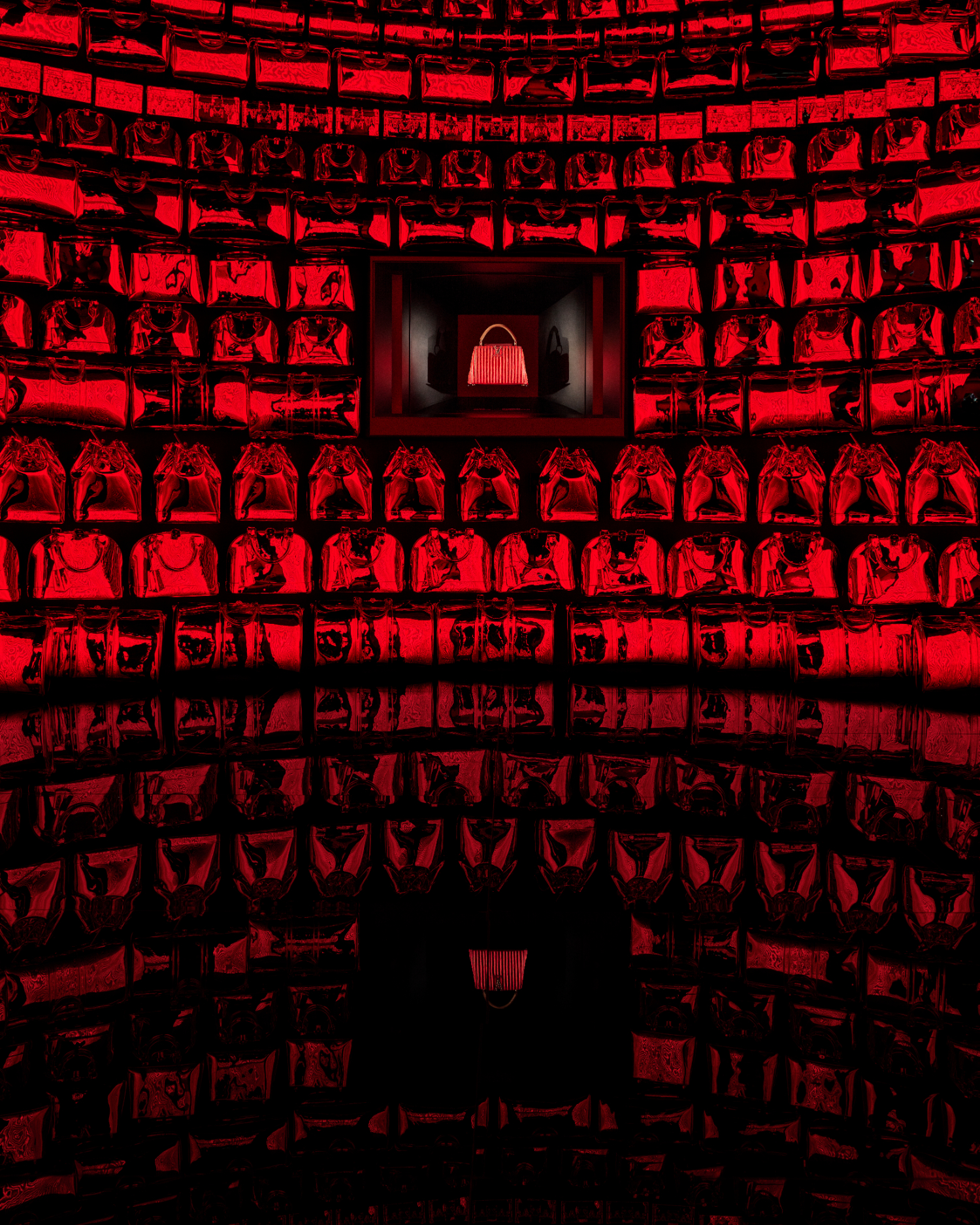 柱状のショーケースが並び万華鏡のような空間でレザーグッズの進化を辿る“アイコン”では、ウィメンズ・コレクション アーティスティック・ディレクターのニコラ・ジェスキエールや、メンズ クリエイティブ・ディレクターのファレル・ウィリアムス、そしてマーク・ジェイコブス、キム・ジョーンズ、ヴァージル・アブローなど歴代のアーティスティック&クリエイティブ・ディレクターの足跡を辿ることができる。