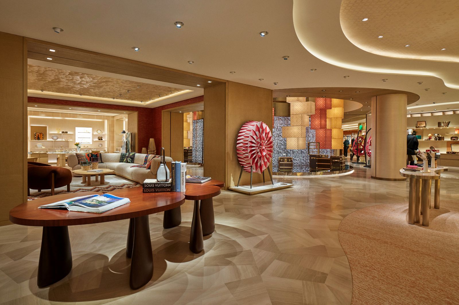 併設されたストアは、韓国伝統のセクドン(赤、黄、青、黒、白5色のストライプ模様)のカラーパレットにちなむデザインで統一。1階はウィメンズ・レザーグッズ、ビューティ、アクセサリー、ウォッチ&ファインジュエリー、2階はウィメンズ・レザーグッズ、プレタポルテ、シューズ、3階はメンズ・セクションで、レザーグッズ、アクセサリー、プレタポルテ、トラベル·コレクションを取りそろえる。4階のギフトショップでは、“アール・ドゥ・ヴィーヴル(豊かなライフスタイル)”への「ルイ・ヴィトン」のアプローチを定義する限定コレクティブル・アイテムを用意する。