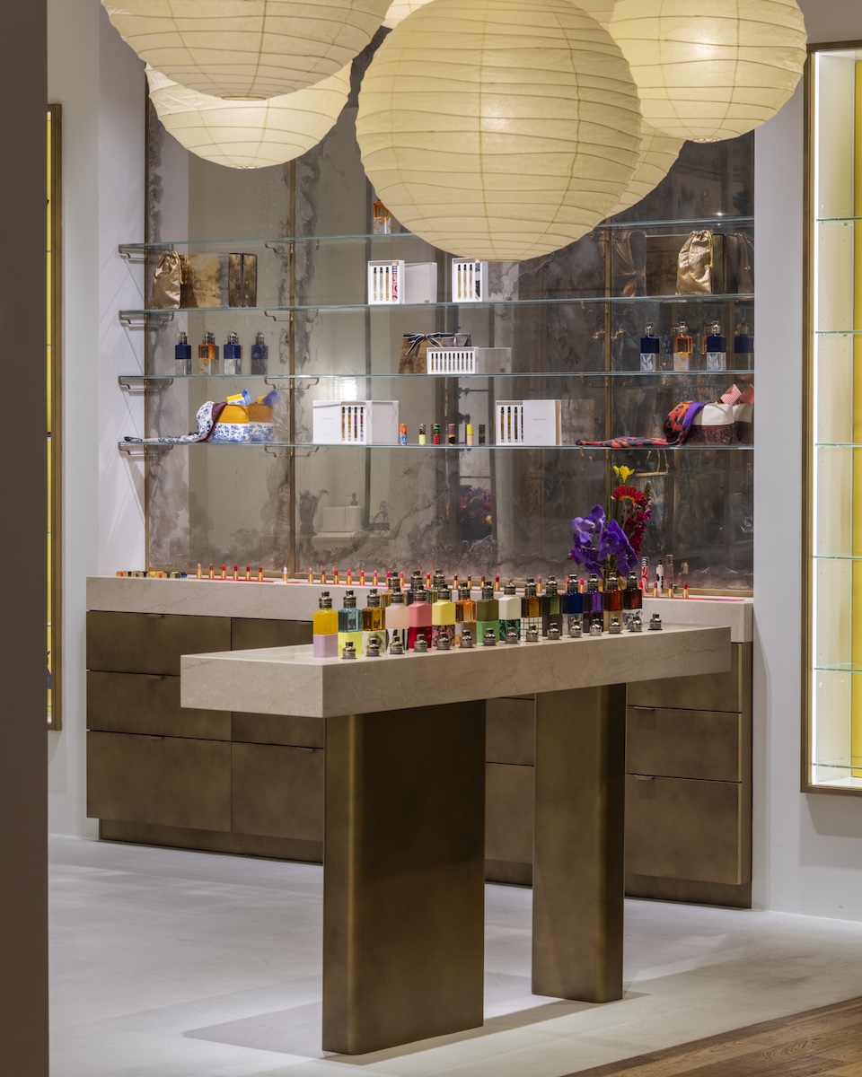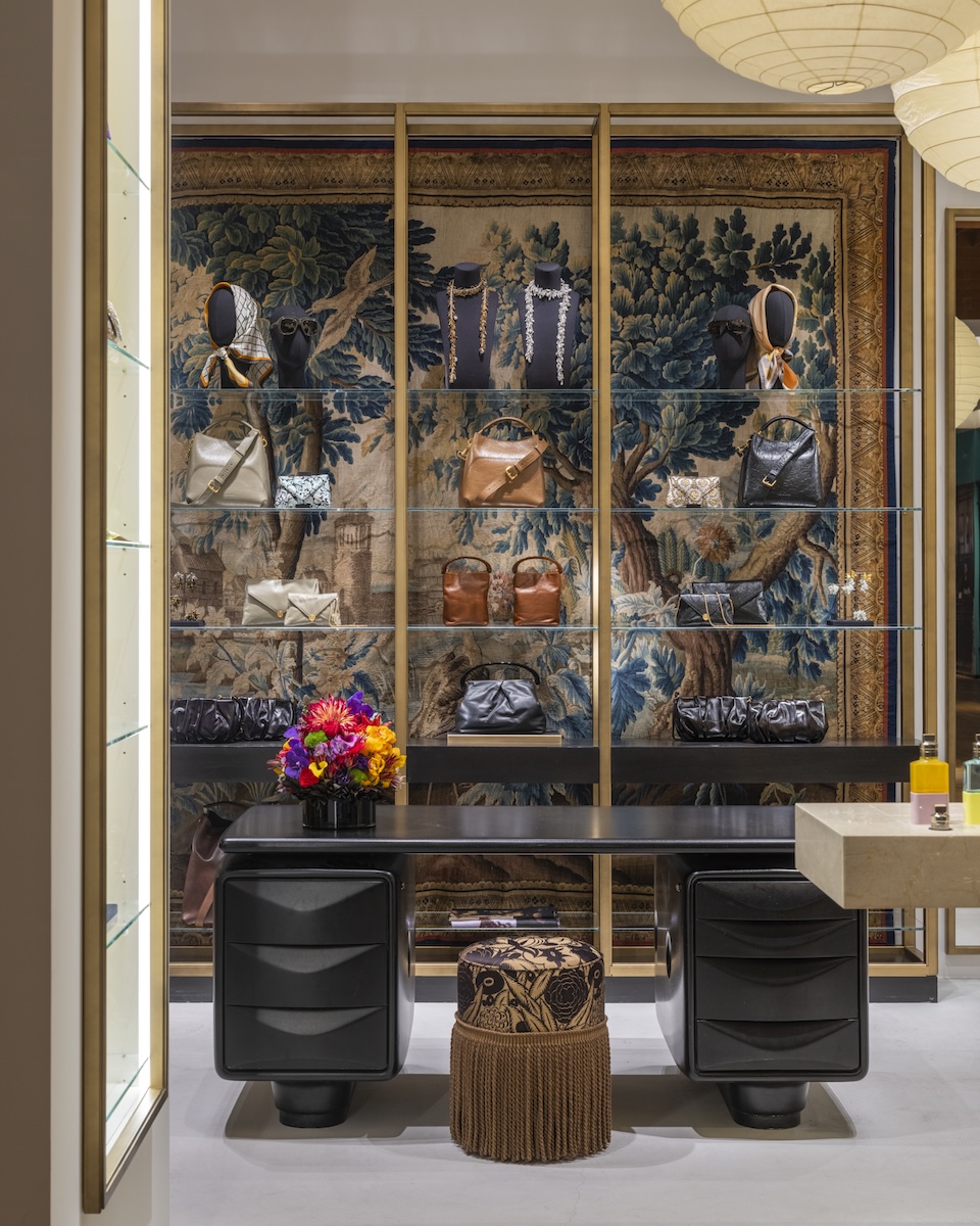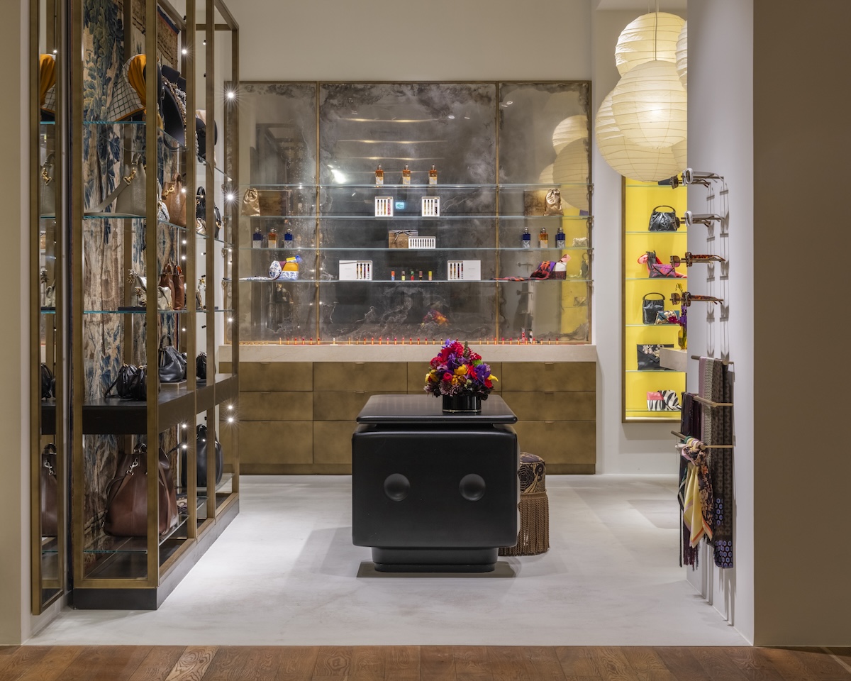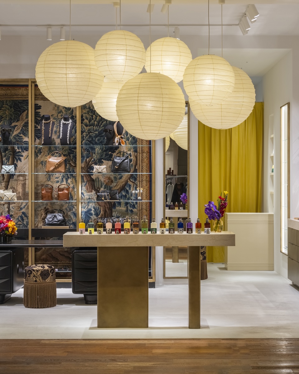 店内は、18世紀のフランドルの織物を背景に据えた壁紙に、中央には、アーネスト・イグル・ホフマン(Ernest Igl Hofmann)がヴィルヘルム・ヴェルンドル(Wilhelm Werndl)のために制作したデスクが配置されている。さらに、岐阜提灯を製造するオゼキが手掛けるイサム・ノグチの“AKARI”ペンダントシェードが備えられている。
