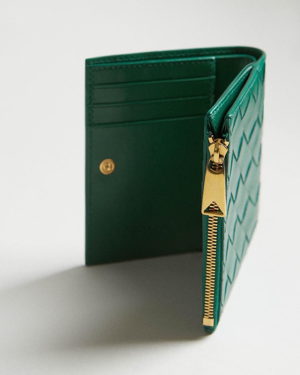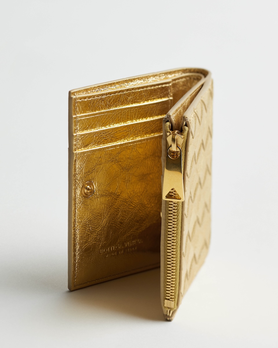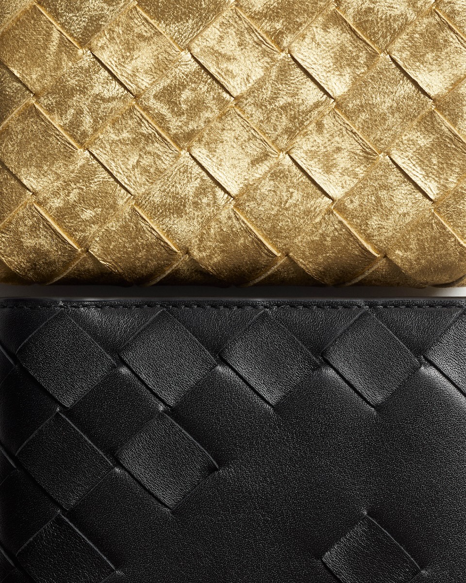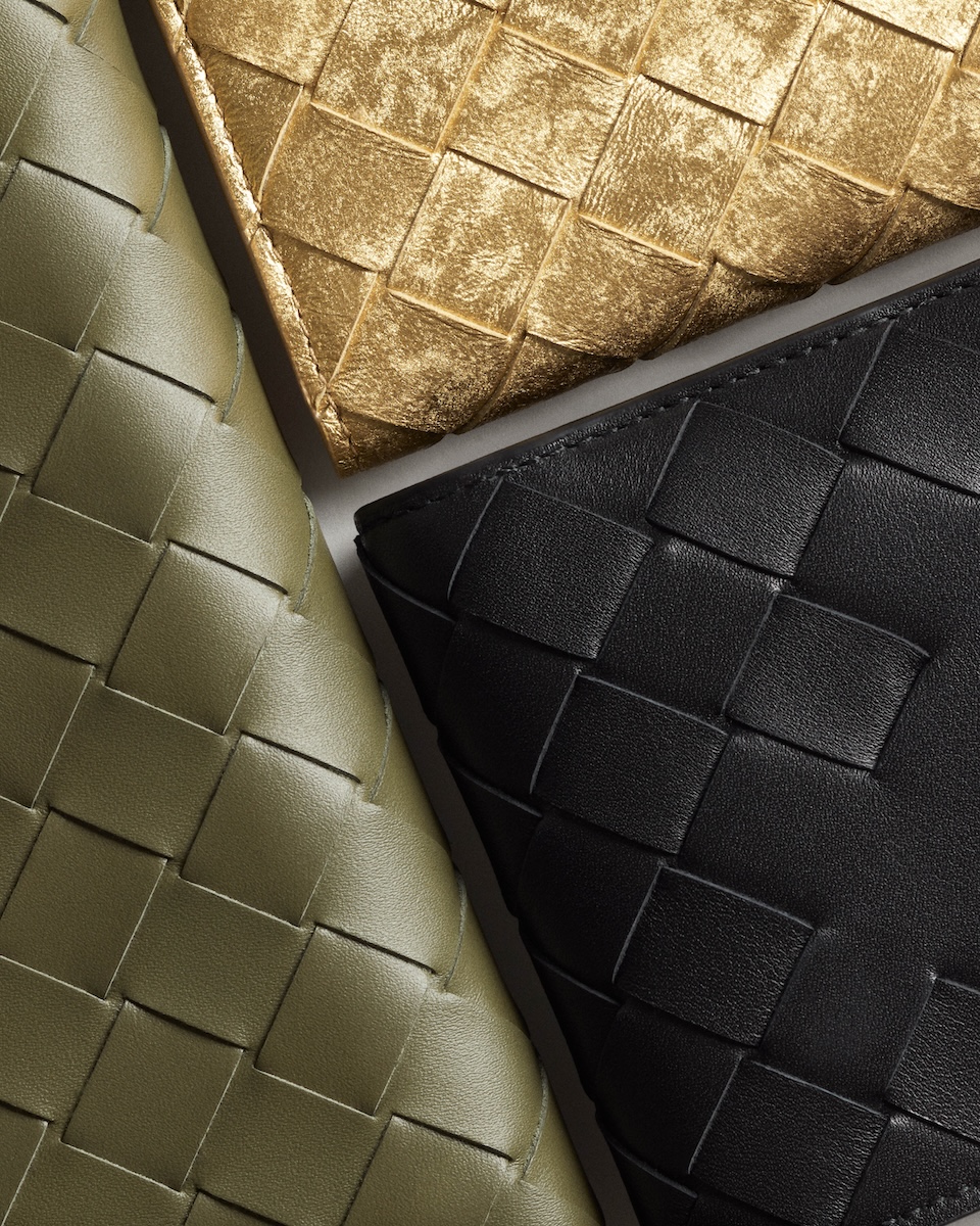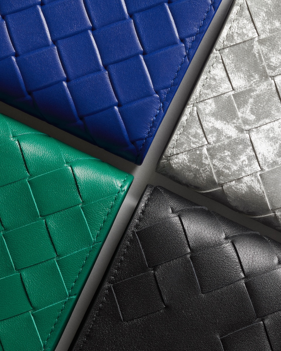 新たに登場したのは、アイコニックなレザーの編み“イントレチャート”をまとったグリーンやシルバー、ゴールドなどの“イントレチャート スモール 二つ折りウオレット”(全5種、10万5600〜12万4300円)だ。また、新作を含め一部のレザーアイテムには、エンボス加工でアルファベット刻印を施すパーソナライゼーションサービスを用意する。