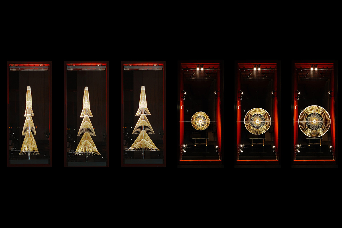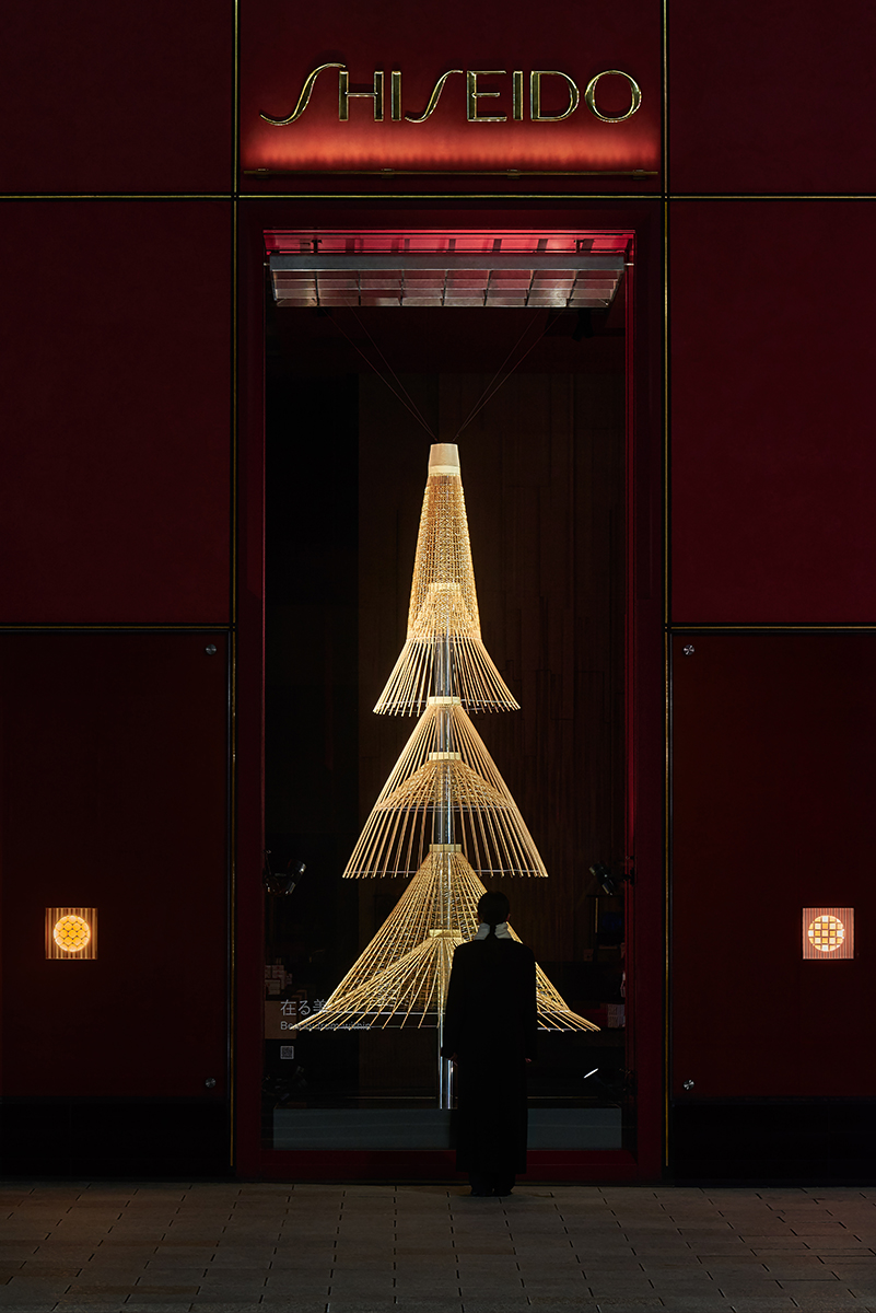 銀座資生堂ビル ウインドーアート「在る美」:東京・銀座の資生堂ビルで2023年10〜12月に展開されたディスプレーをデザイン。「伝統工芸が持つ日本古来の美意識」をテーマに、京都の和傘職人とともにクリスマス装飾を制作し、資生堂の美学を通じて街を行き交う人々の心を彩った PHOTO : MASAYUKI HAYASHI