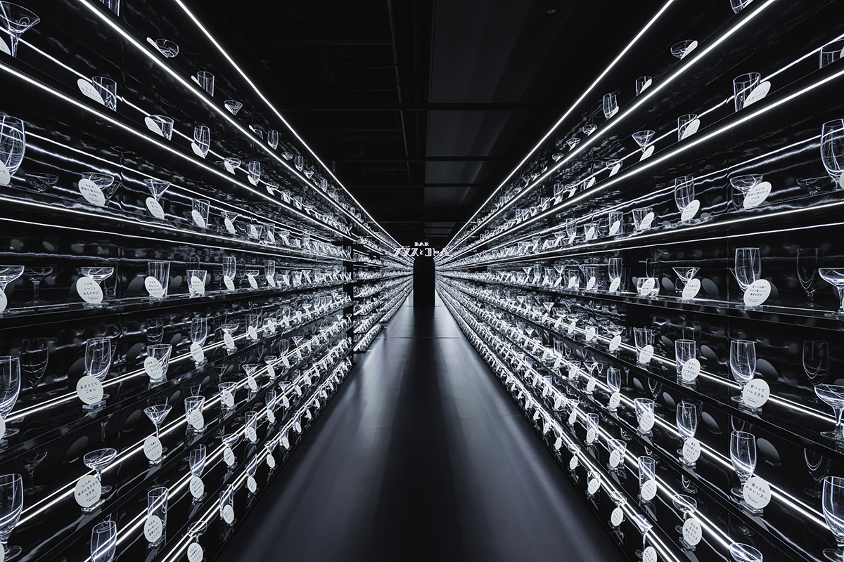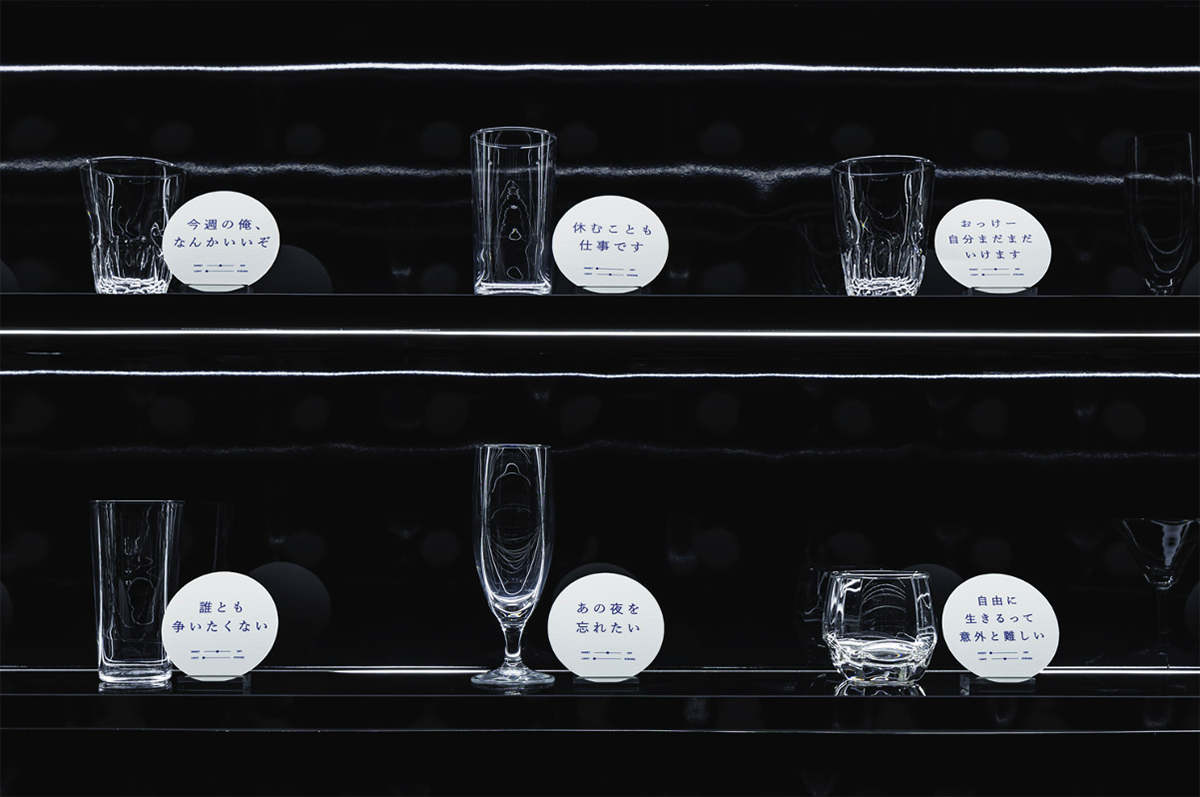 サントリー バー「グラスとコトバ」:渋谷キャストで開催されたサントリーの洋酒のイベントプロモーションを担当。壁一面に飾られたグラスと、さまざまな気持ちを表す言葉が記されたコースターから好みのものを選ぶと、そのイメージに合ったカクテルが楽しめるバー「グラスとコトバ」を設計。カクテルの新しい楽しみ方を提案した。企画立案はチョコレイト、博展は空間デザインと体験設計、施工を担当した