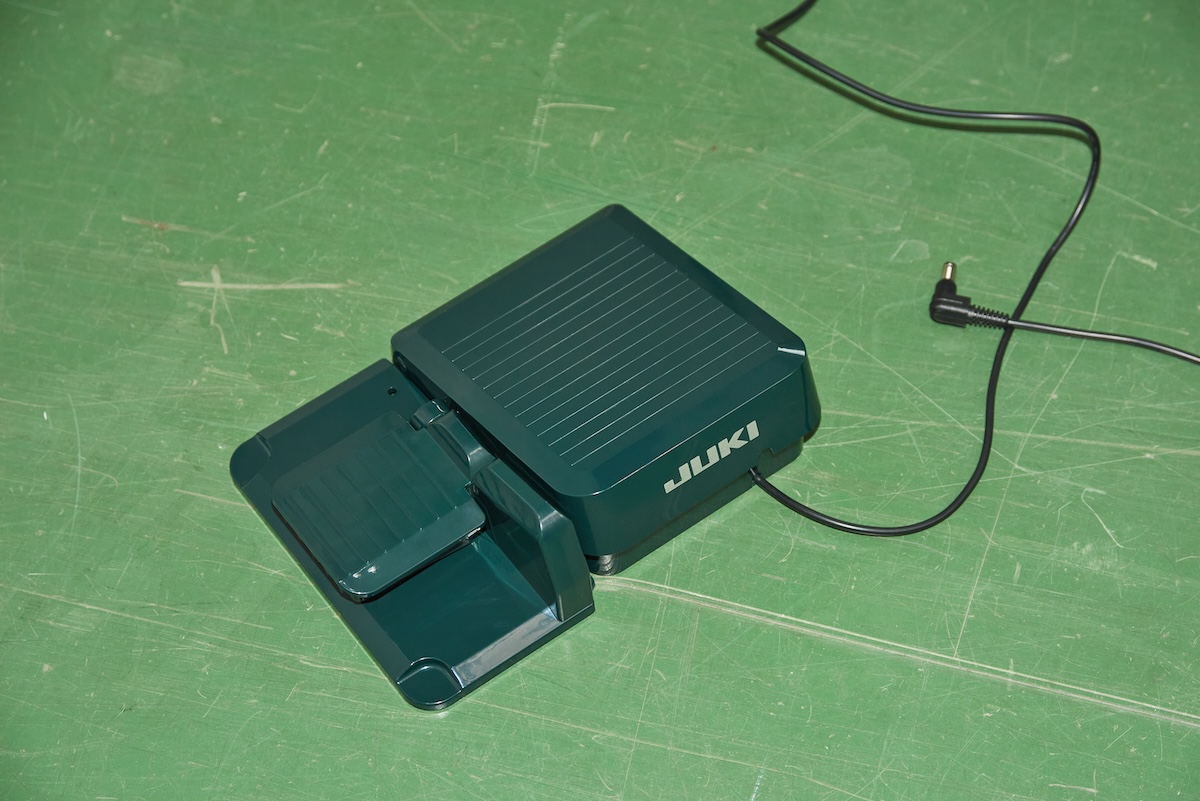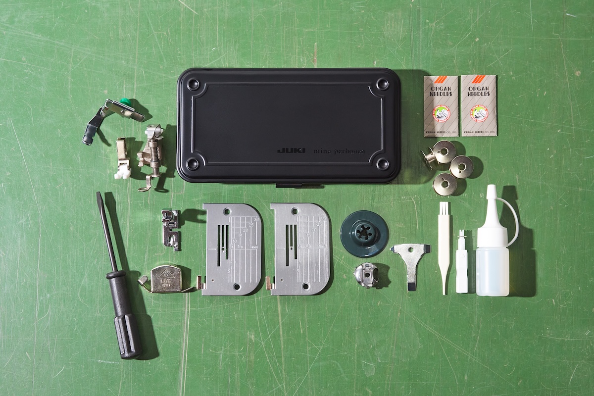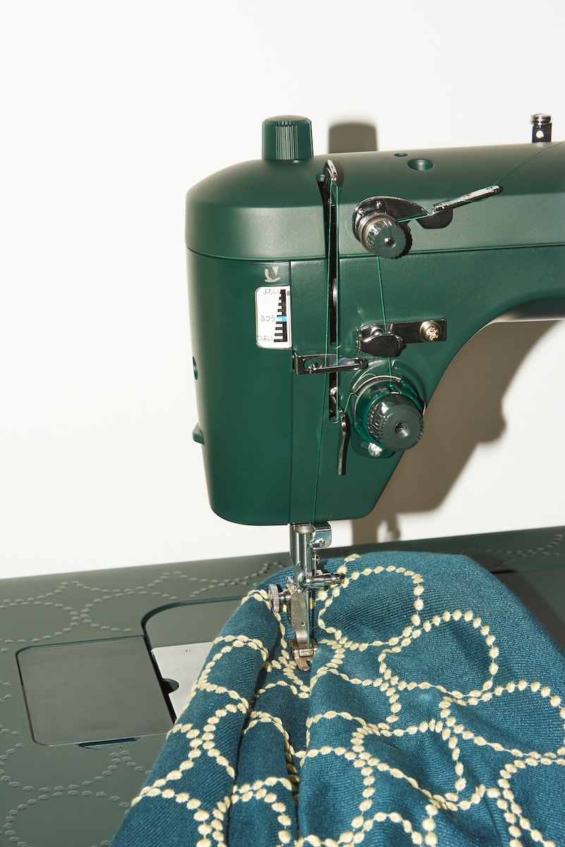 同アイテムは、JUKIの職業用ミシンをベースに「ミナ ペルホネン」のテキスタイル“タンバリン”のデザインをワイドテーブルにあしらい、マットな質感のディープグリーンのボディーで仕上げた。“生活空間にもなじむミシン”をコンセプトに、細部のパーツ一つまでこだわったミシンに仕上げた。