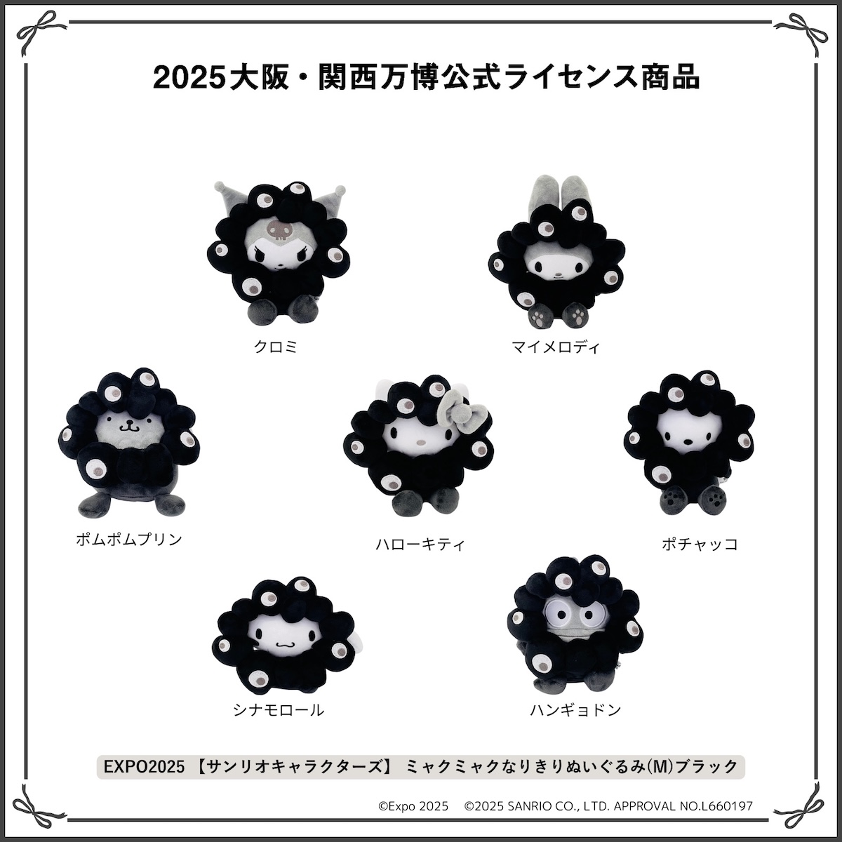 2025大阪・関西万博公式ライセンスアイテム“エキスポ2025 ミャクミャク サンリオキャラクターズ コラボレーショングッズ”から、ブラックぬいぐるみシリーズを受注販売する。受注販売特設サイトで12月19日12時から受け付けを開始する。各アイテム各キャラクター1個までの購入制限を設け、予定販売数に達し次第、予約受け付けを終了する。