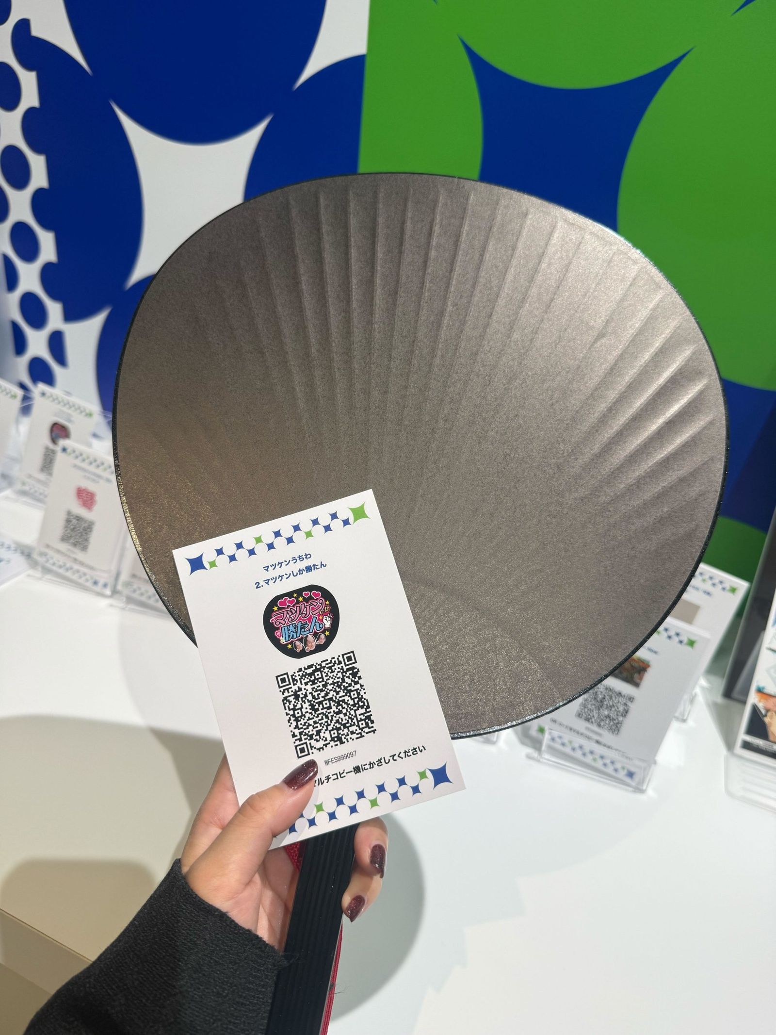 その体験ができるのが、1階にある「推し活ファミマプリント」ブースで、体験時間は約15分。まずは用意されたカードの中から作りたい応援うちわのデザインを選び、スタッフに渡します。私は会場限定デザインの「マツケンしか勝たん」をチョイス。マルチコピー機にカードのQRコードをかざすと、A3サイズの用紙がプリントアウトされます。あとはそれをうちわに合わせて切って、貼るだけで完成。