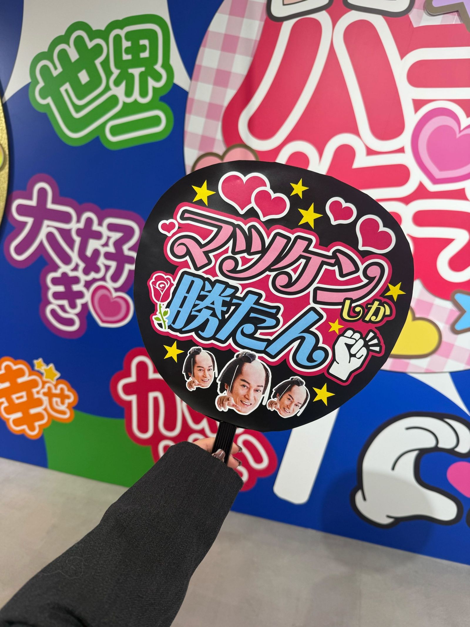 最後にシールを貼って少し華やかさをプラスしたりと、アレンジも可能です。両サイドにつけた天使の羽のシールは、男性スタッフから教えていただいた小技。スタッフも知識豊富で、さまざまなアドバイスくれます。今回、このうちわを松平健さんにアピールすることはかないませんでしたが、次の“マツケン現場”には必ず持って行きたいと思います。