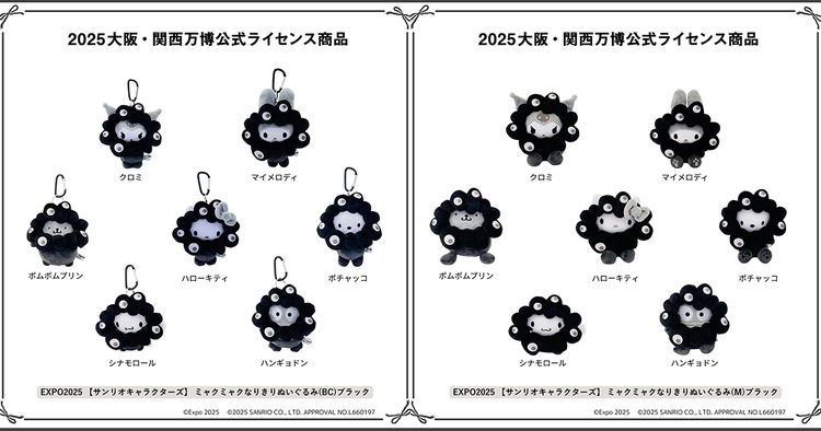 2025大阪・関西万博公式ライセンスアイテム“エキスポ2025 ミャクミャク サンリオキャラクターズ コラボレーショングッズ”から、ブラックぬいぐるみシリーズを受注販売する。受注販売特設サイトで12月19日12時から20日23時59分まで受け付けを開始する。各アイテム各キャラクター1個までの購入制限を設け、予定販売数に達し次第、予約受け付けを終了する。