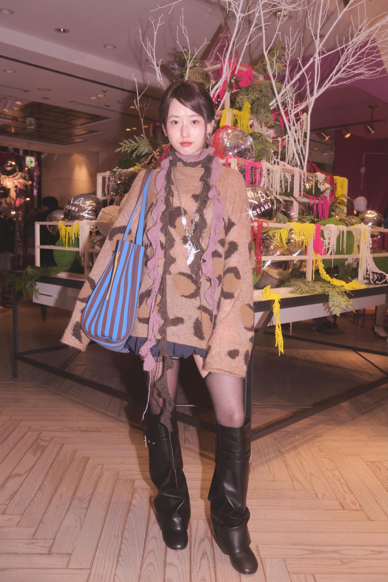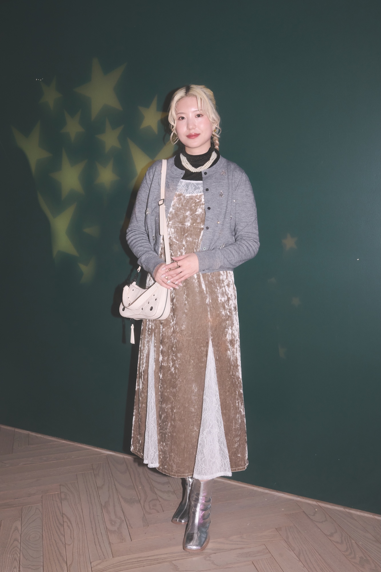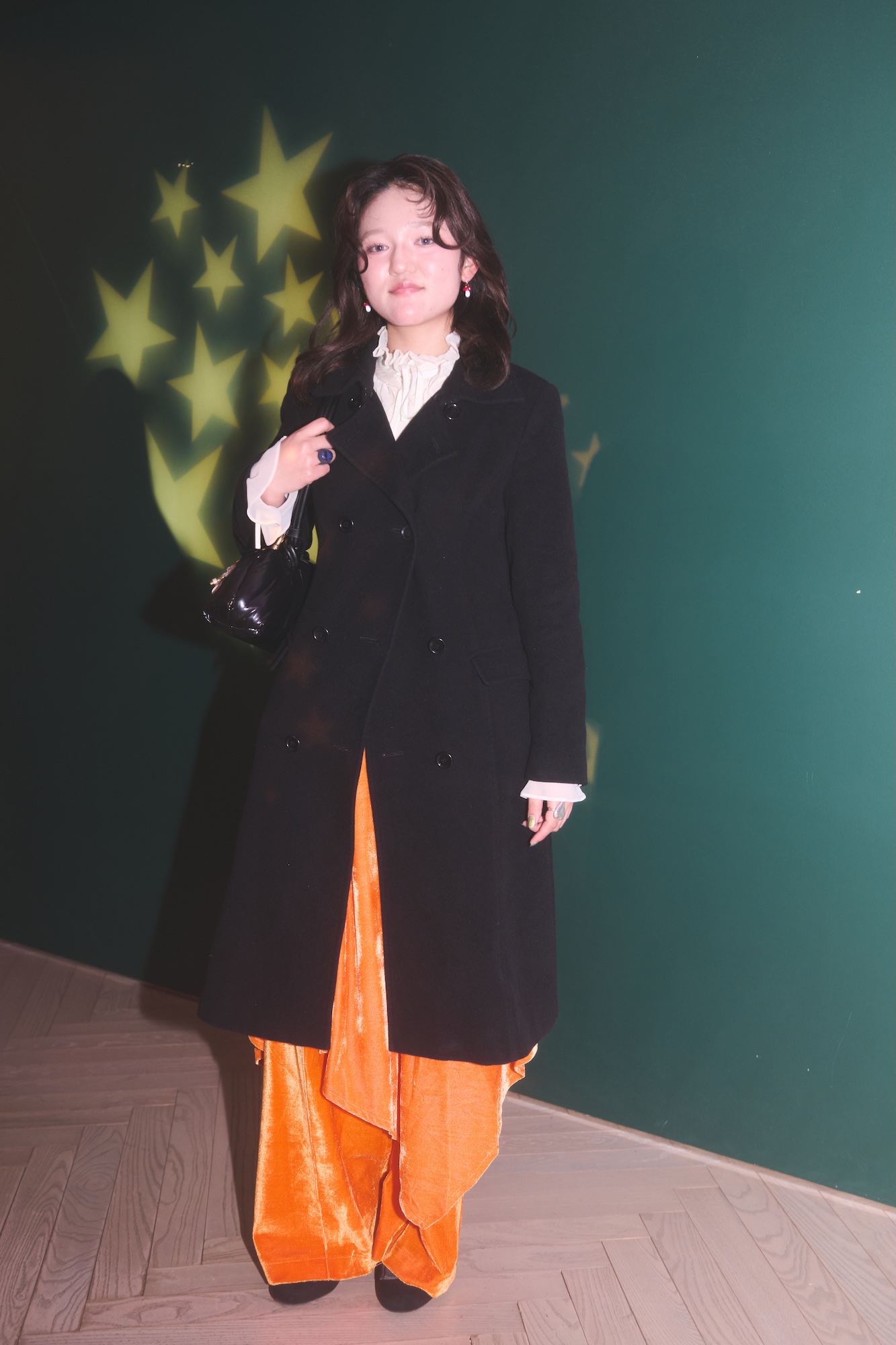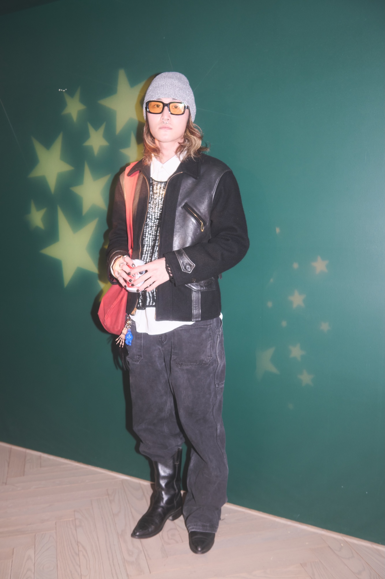当日のドレスコードは“パーティースタイル”。会場には、スパンコールやファーといった装飾性の高いアイテムで、色鮮やかなスタイリングの来場者が目立つ一方、テーラードジャケットやレザーアイテムを軸にシックにまとめたスタイルも多く見られた。足元は「メゾン マルジェラ(MAISON MARGIELA)」のタビブーツやウエスタンブーツをはじめとしたポインテッドトゥのレザーシューズが主流だった。ほか、大胆なファーシューズを選ぶ来場者の姿もあった。シルエットや素材感で個性を表現しながらそれぞれがホリデームードを楽しんでいた。