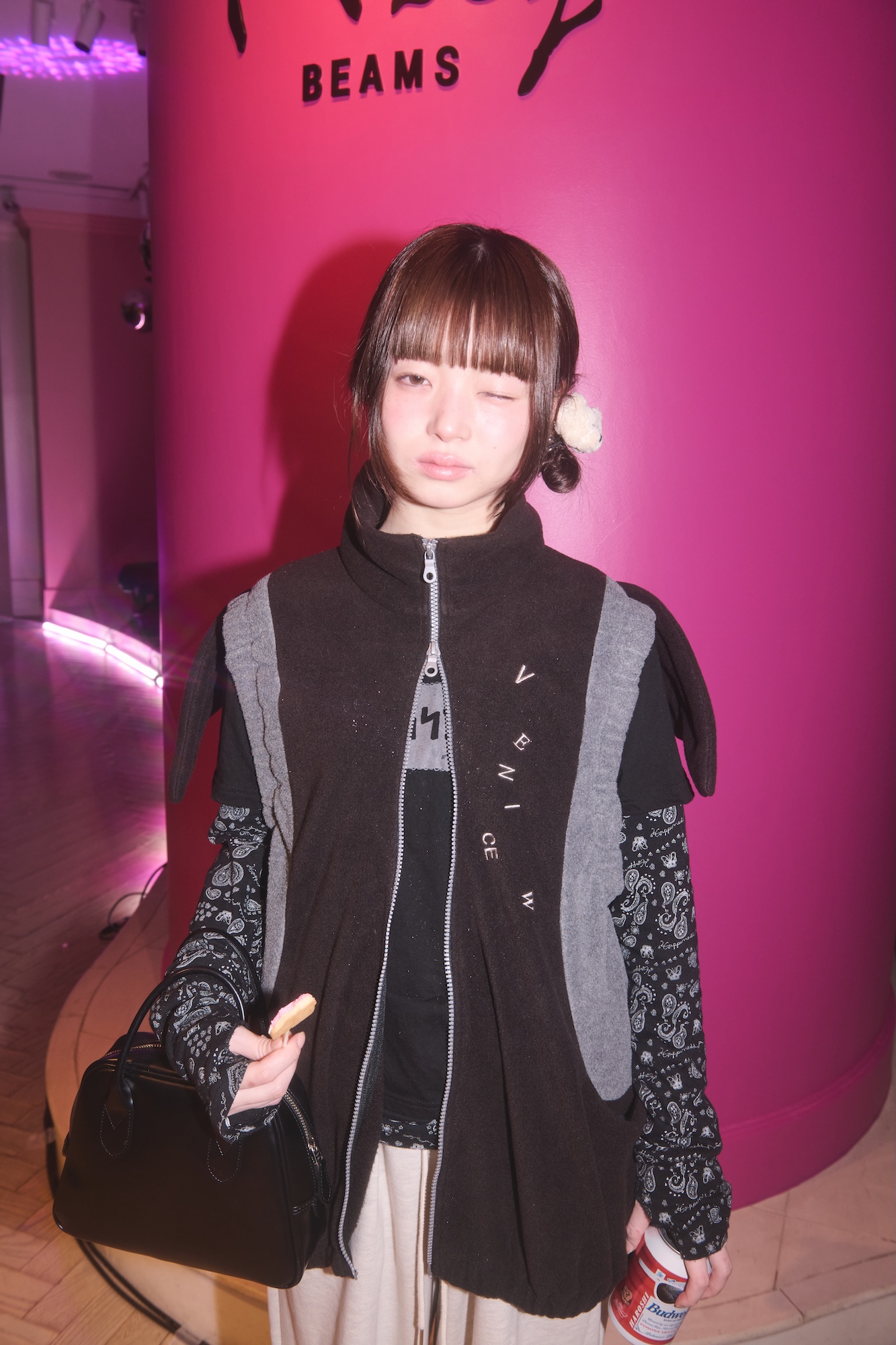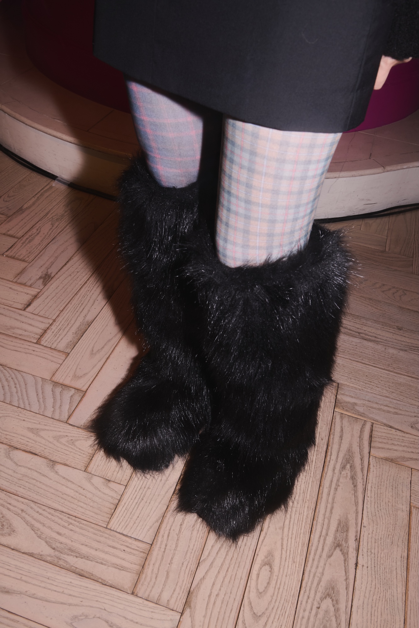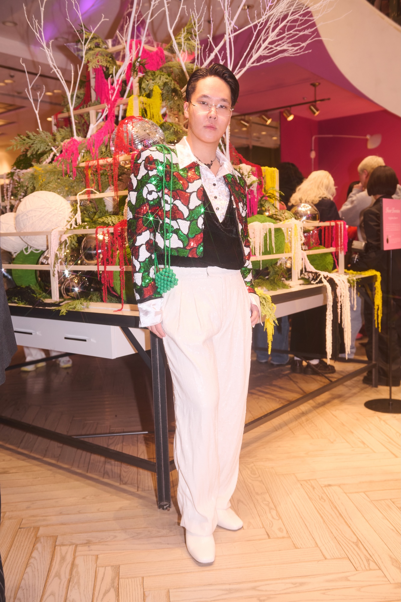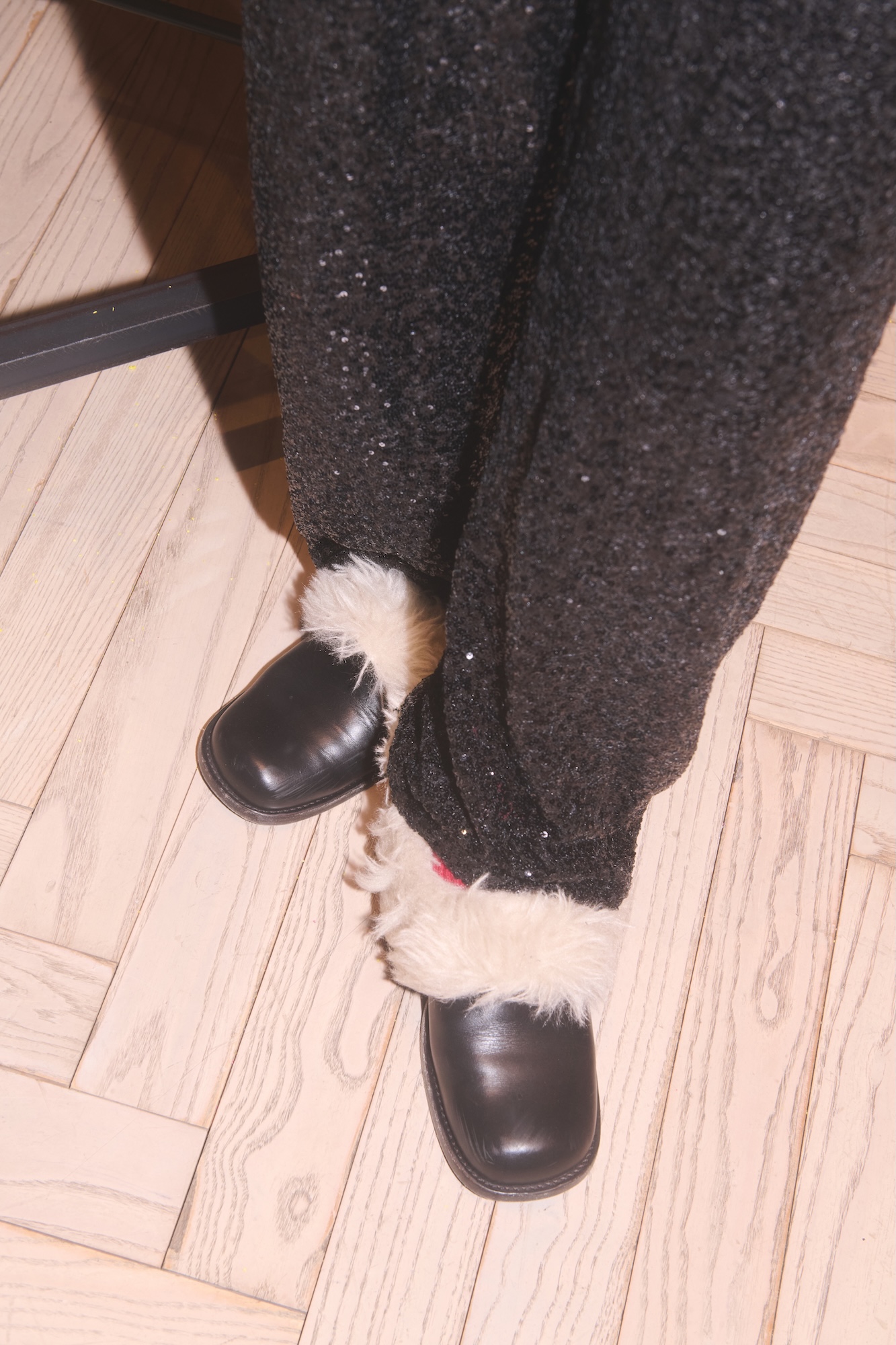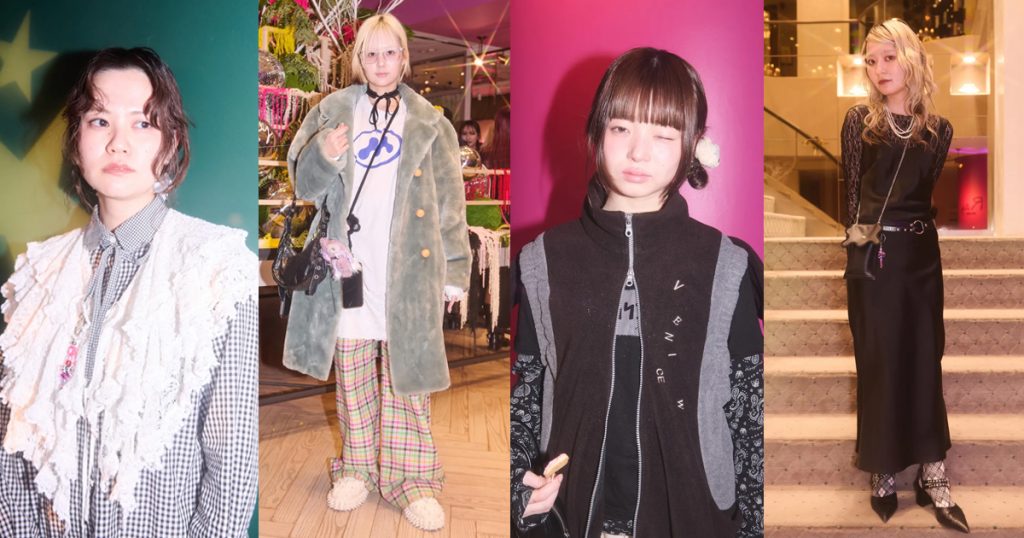 当日のドレスコードは“パーティースタイル”。会場には、スパンコールやファーといった装飾性の高いアイテムで、色鮮やかなスタイリングの来場者が目立つ一方、テーラードジャケットやレザーアイテムを軸にシックにまとめたスタイルも多く見られた。足元は「メゾン マルジェラ(MAISON MARGIELA)」のタビブーツやウエスタンブーツをはじめとしたポインテッドトゥのレザーシューズが主流だった。ほか、大胆なファーシューズを選ぶ来場者の姿もあった。シルエットや素材感で個性を表現しながらそれぞれがホリデームードを楽しんでいた。