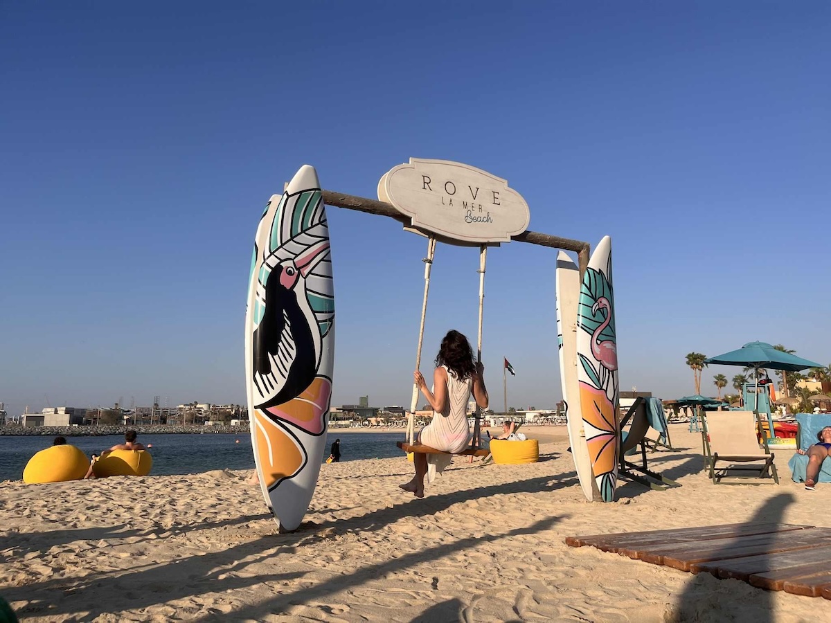 最初に滞在したのはドバイで最先端の人口ビーチリゾート、ラ・メールのビーチサイドにあるホテル。ここは目の前にプライベートビーチが広がり、フォトジェニックなブランコがあるなど、思わず撮影したくなる仕掛けもたくさん。周囲にはスタイリッシュなレストランやバーが並び、そのパティオやバーのインテリアを見比べて歩くだけで楽しかった。夜はラウンジとして盛り上がっているらしい。それが徒歩圏内なのだから、夜遊びにはもってこいだ。