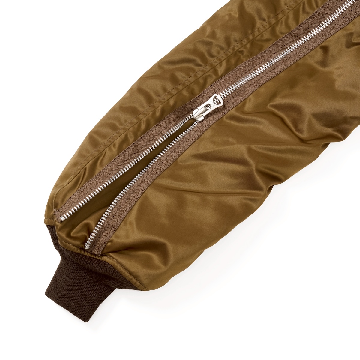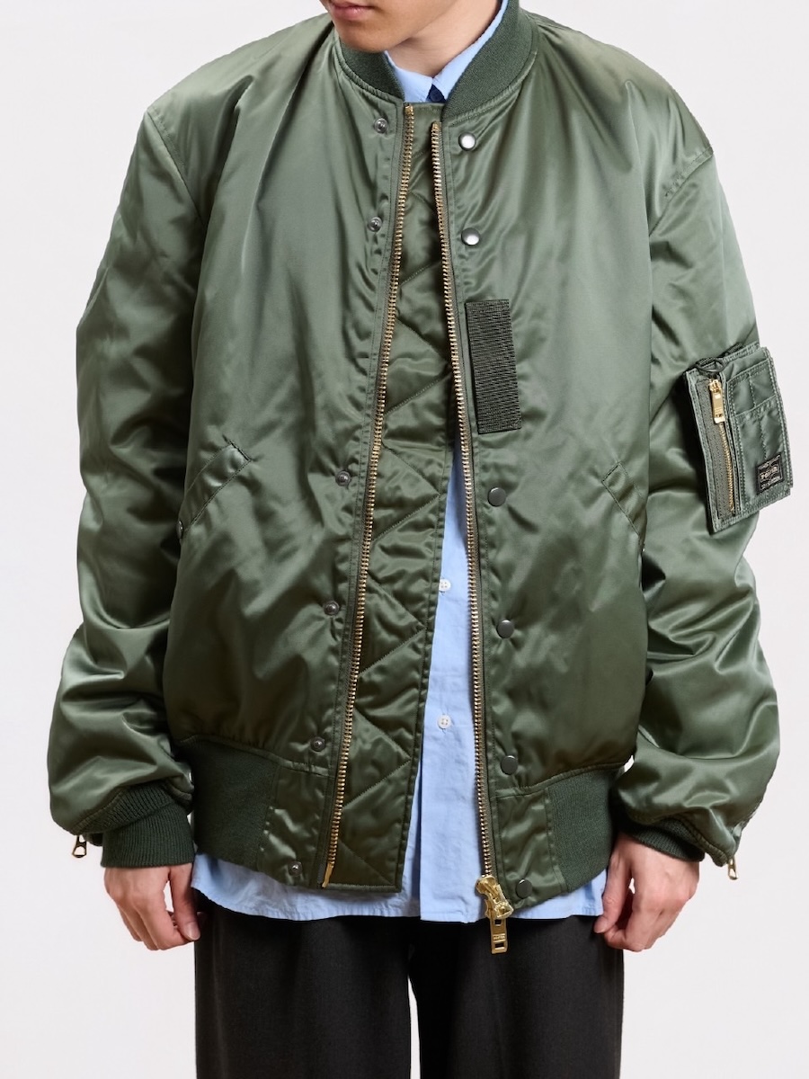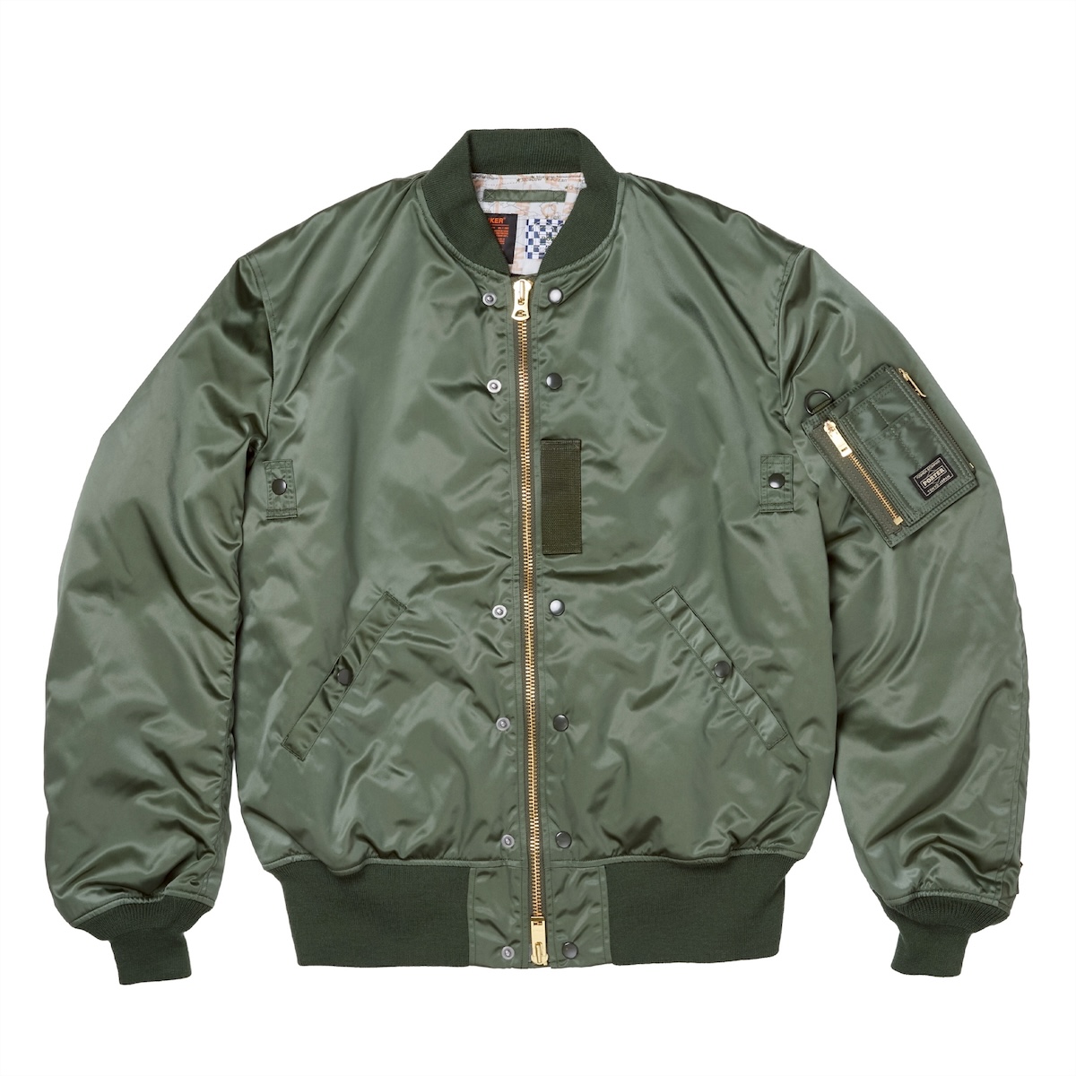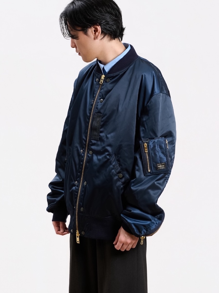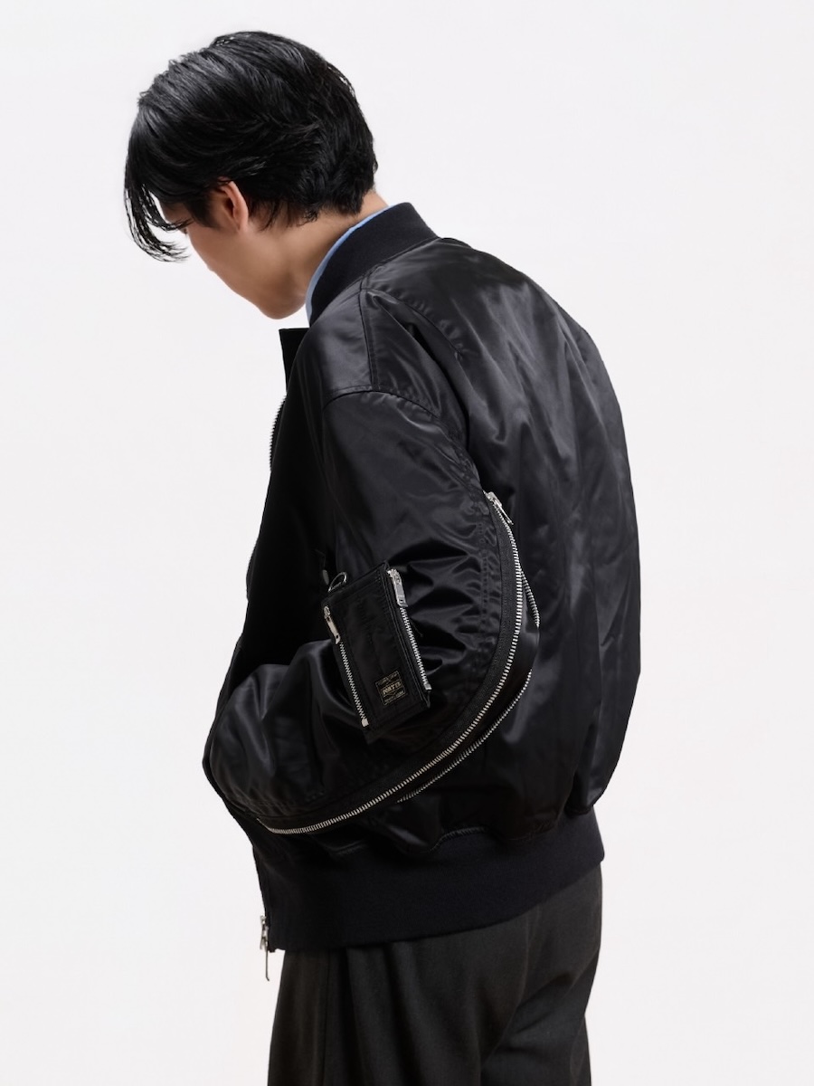 本コラボレーションでは、フライトジャケットの代名詞“MA-1”に、「ポーター」を代表するシリーズ“タンカー”で採用している100%植物由来のナイロンを融合させた“バズリクソンズ×ポーター MA-1&ウオレット”(全4色、各14万3000円)をラインアップする。ジャケットの左袖に取り付けられたシガレットポケットは、着脱可能な「ポーター」のウオレットで表現し、中綿には「3M(スリーエム)」が開発した軽量かつ保温性の高いシンサレート高機能中綿素材を採用した。ライニングには、かつてのフライトジャケットにあしらっていた“トラベリングマップ”を取り入れ、柄配置はランダムになっている。