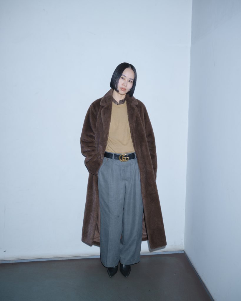 「ホダコヴァ」のコレクションでは、同素材のスカートとのセットアップで提案されていて、黒のベルトで引き締めていたのがすごくすてきだったんです。それを見て、私も黒のベルトを通して着るようにしています。