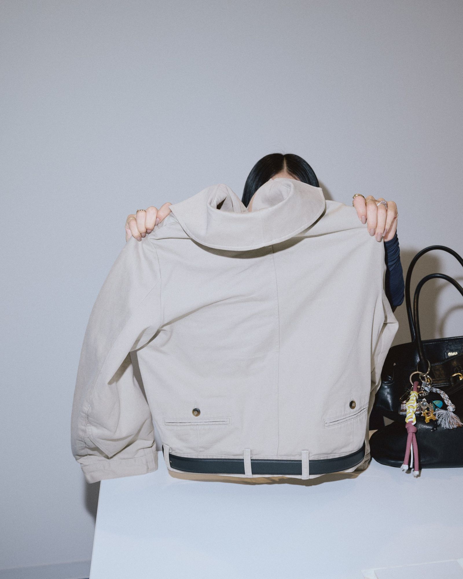 濱本:ビンテージにもありそうな作業着っぽいデザインですが、このミニマムなシルエットは新品だからこその魅力だなって思うんです。オーバーサイズをがばっと着るのもいいですが、コンパクトなサイズをモダンに着こなしたくて、XSサイズを選びました。