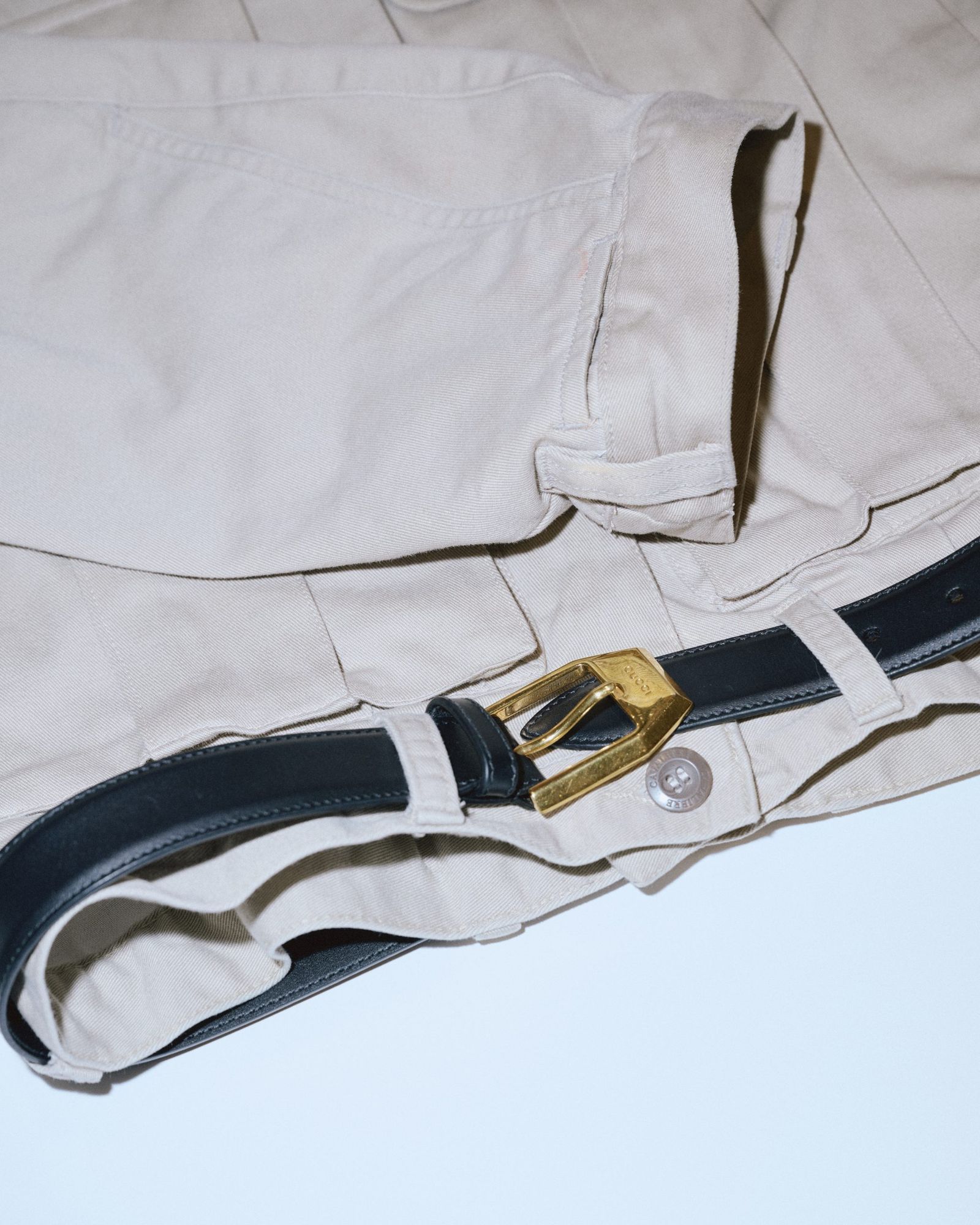 濱本:「ミュウミュウ(MIU MIU)」の“アバンチュール ナッパレザー バッグ”。もともとスモールバッグを持つことが多かったのですが、昨年秋に娘が生まれてからは、必然的に大きなサイズを選ぶように。このバッグは、ビンテージっぽいゴールドのパーツがとにかくかわいい。今日のスタイリングのように、ゴールドバックルのベルトと合わせて、リンク感を出すのにハマっています。