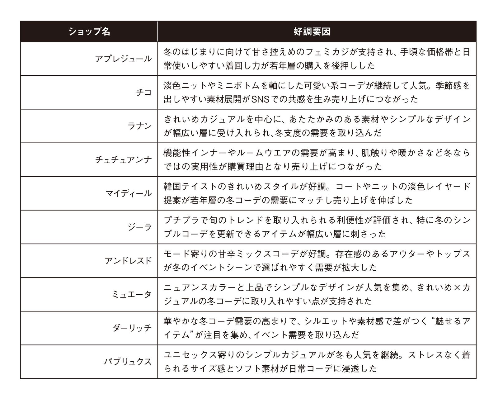 ボトムスは、脚見せ×ショートブーツの組み合わせが定番化し、ミニ丈の人気が継続。季節を問わず支持されており、Y2Kリバイバルの流れも後押ししている。