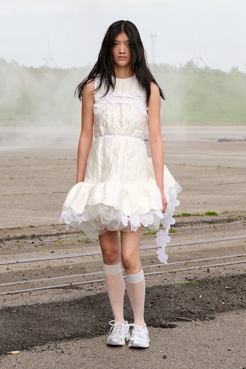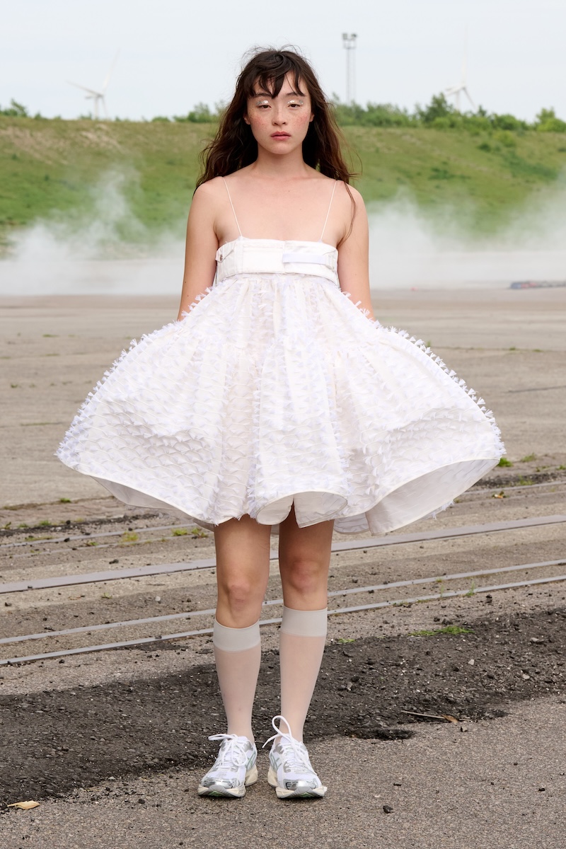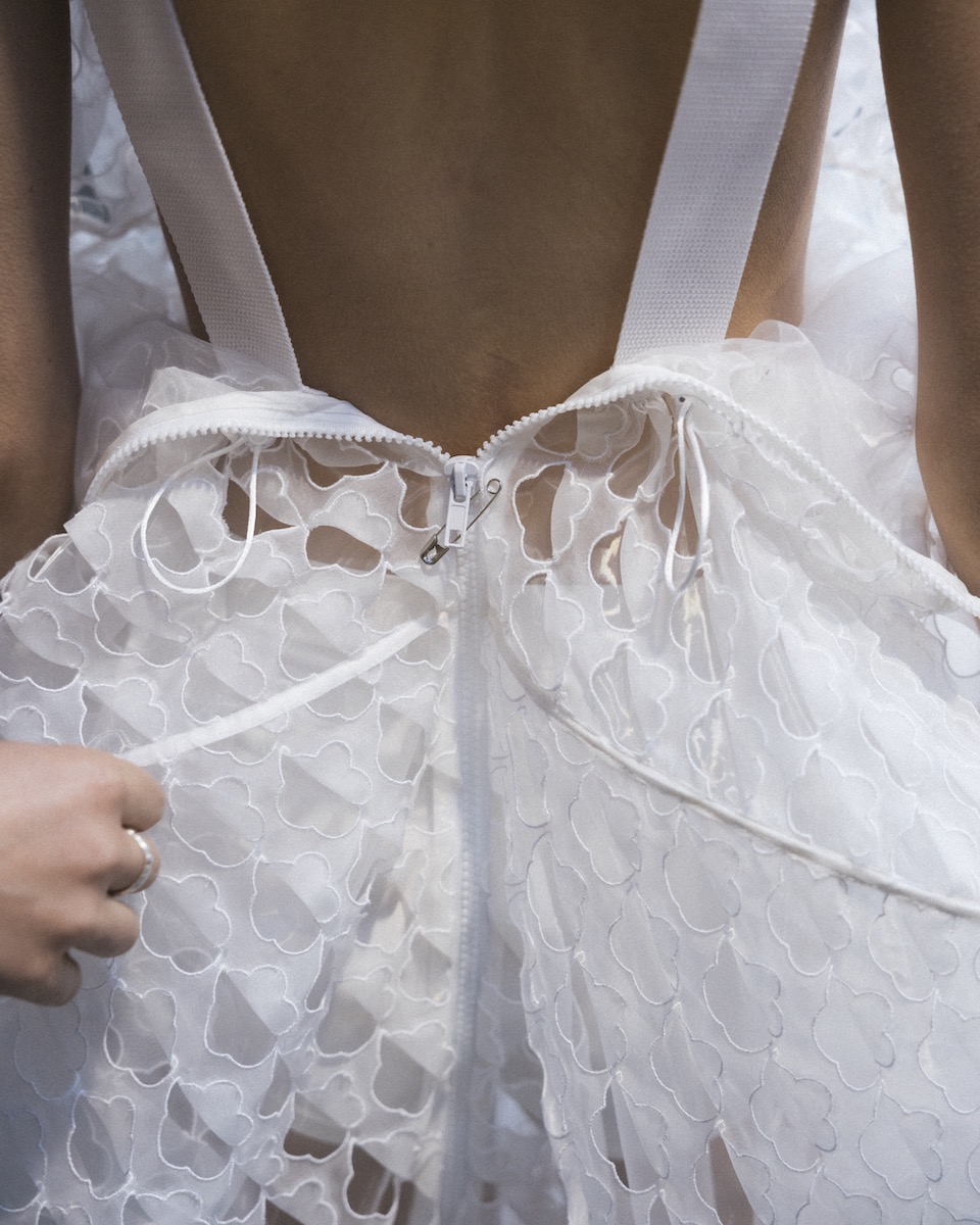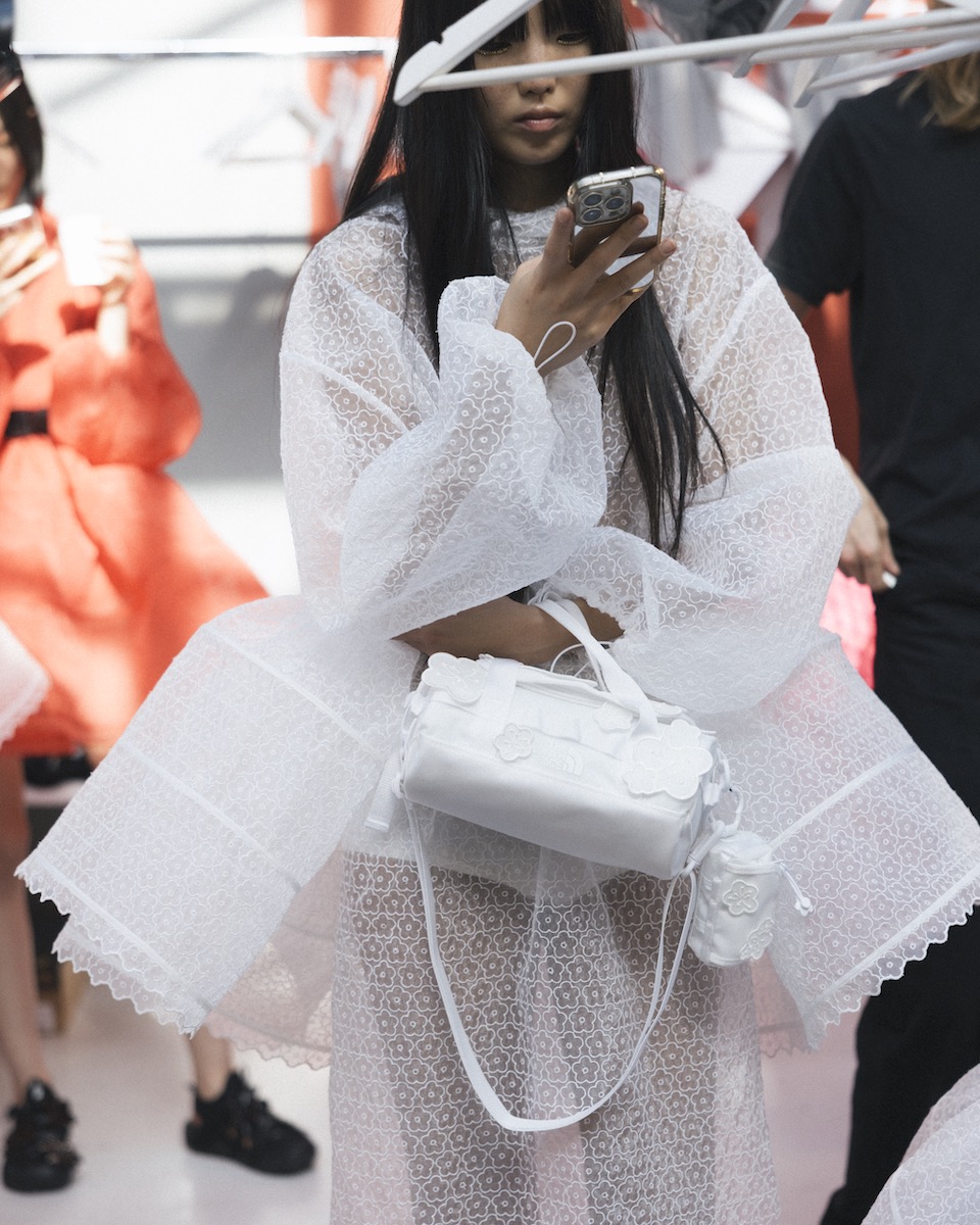 セシリー:今季は、一つの花のモチーフを多様な手法で表現することに取り組みました。素材開発に重きを置いたことで、シルエットへの意識がより高まり、それがより立体的で弾むようなフォルムにつながったと言えます。そしてラストを飾ったマゼンタのルックは、まずオーガンジーに刺しゅうを施し、それを折り重ねて陰影を作ったもの。とてもクチュール的な手法ですが、スポーティーな素材や鮮やかな色を掛け合わせることで、新しいバランスを生まれました。「Aマガジン」で取り組んだ「ザ・ノース・フェイス」とのアップサイクル企画からも、ユーティリティーのディテールが潜む白いドレスなどのショーピースへのヒントを得ています。