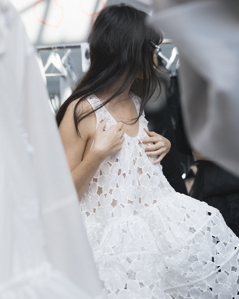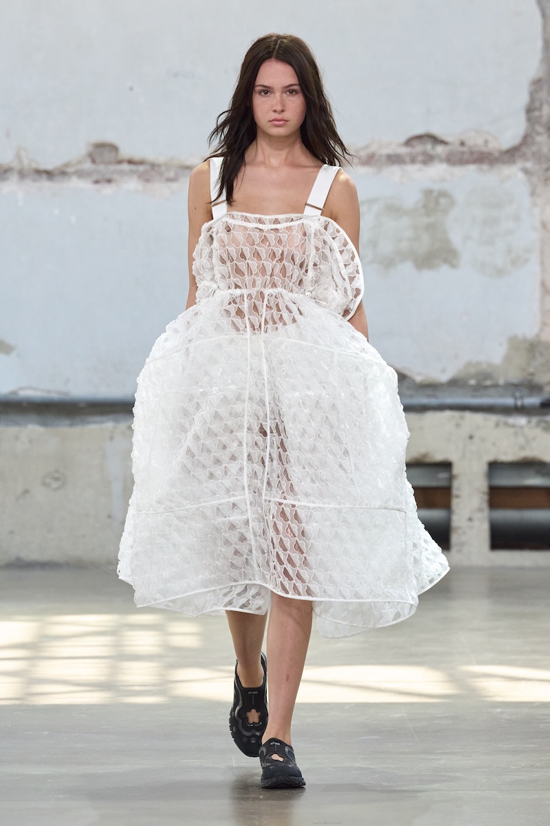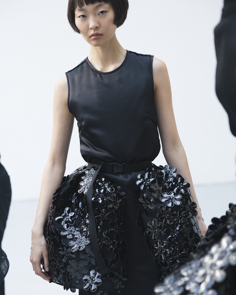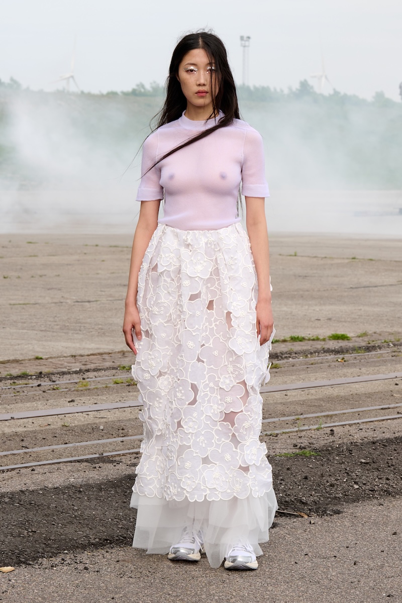 セシリー:今季は、一つの花のモチーフを多様な手法で表現することに取り組みました。素材開発に重きを置いたことで、シルエットへの意識がより高まり、それがより立体的で弾むようなフォルムにつながったと言えます。そしてラストを飾ったマゼンタのルックは、まずオーガンジーに刺しゅうを施し、それを折り重ねて陰影を作ったもの。とてもクチュール的な手法ですが、スポーティーな素材や鮮やかな色を掛け合わせることで、新しいバランスを生まれました。「Aマガジン」で取り組んだ「ザ・ノース・フェイス」とのアップサイクル企画からも、ユーティリティーのディテールが潜む白いドレスなどのショーピースへのヒントを得ています。