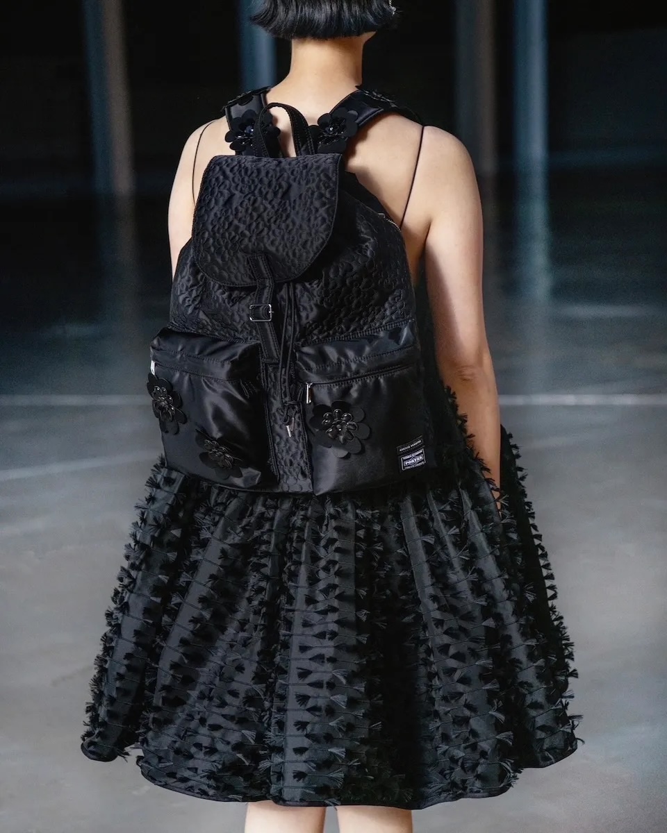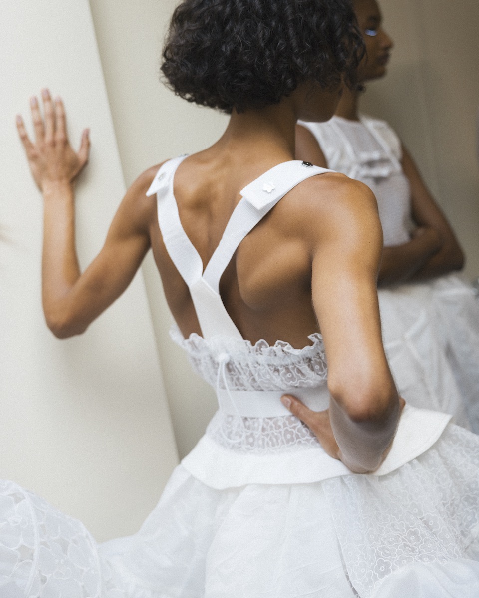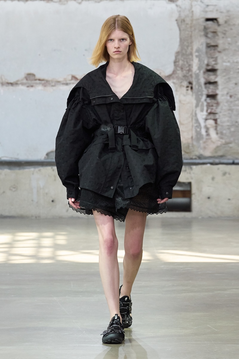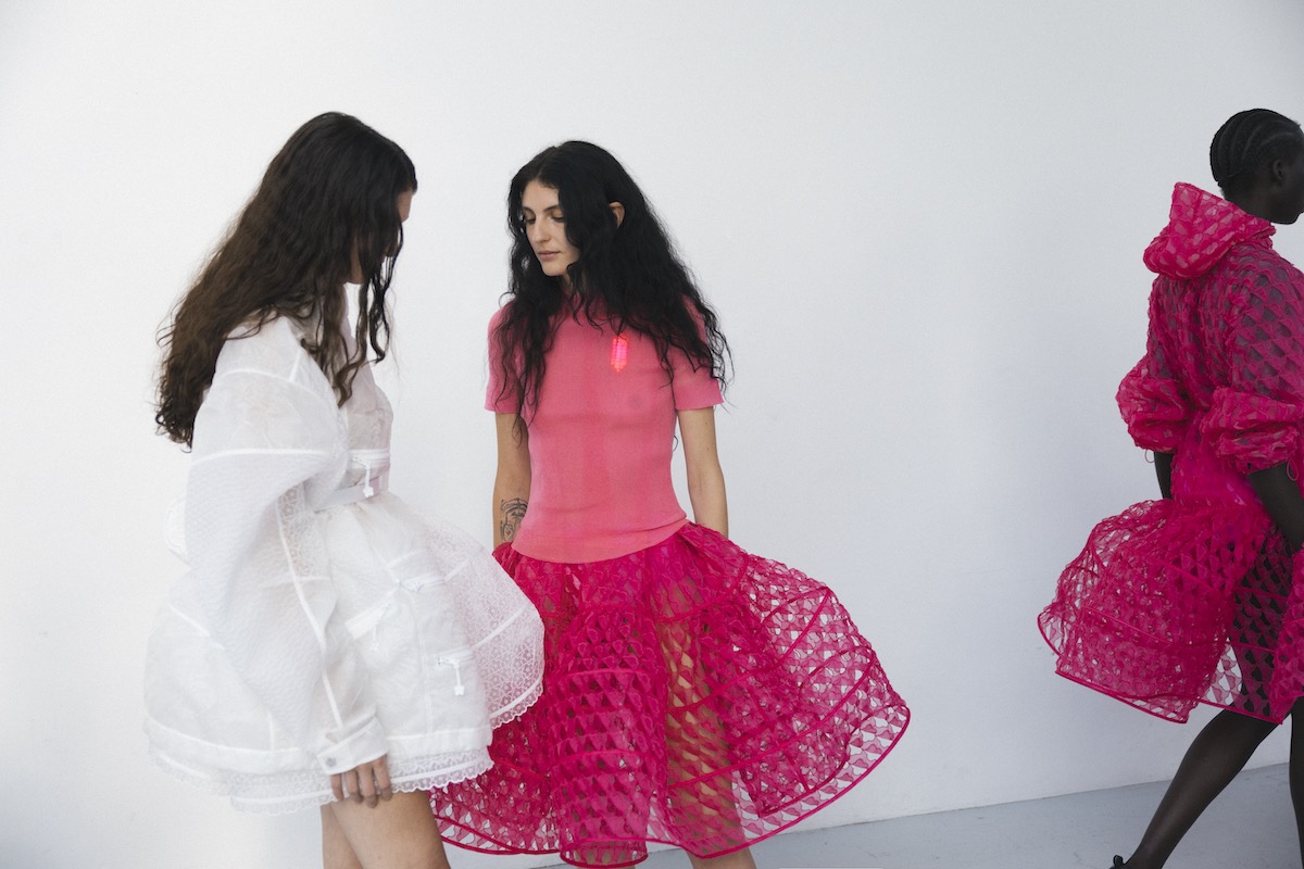 セシリー:今季は、一つの花のモチーフを多様な手法で表現することに取り組みました。素材開発に重きを置いたことで、シルエットへの意識がより高まり、それがより立体的で弾むようなフォルムにつながったと言えます。そしてラストを飾ったマゼンタのルックは、まずオーガンジーに刺しゅうを施し、それを折り重ねて陰影を作ったもの。とてもクチュール的な手法ですが、スポーティーな素材や鮮やかな色を掛け合わせることで、新しいバランスを生まれました。「Aマガジン」で取り組んだ「ザ・ノース・フェイス」とのアップサイクル企画からも、ユーティリティーのディテールが潜む白いドレスなどのショーピースへのヒントを得ています。