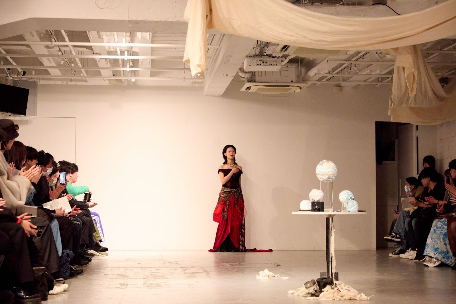 学園祭とは異なり、部員たちで会場をリサーチしたり、照明や空間のコントロールも自由度が上がった今回のショー。自身もモデルとして出演した代表の池田安喜さんは「学園祭を経て、部員たちがショーに対するアプローチ方法を明確に持つことができた。プログラミングが得意な部員が音と連動する映像を制作し放映、立体造形に長けた部員が小道具を用意するなど、各々の得意分野を活かして工夫を凝らした」と語る。
