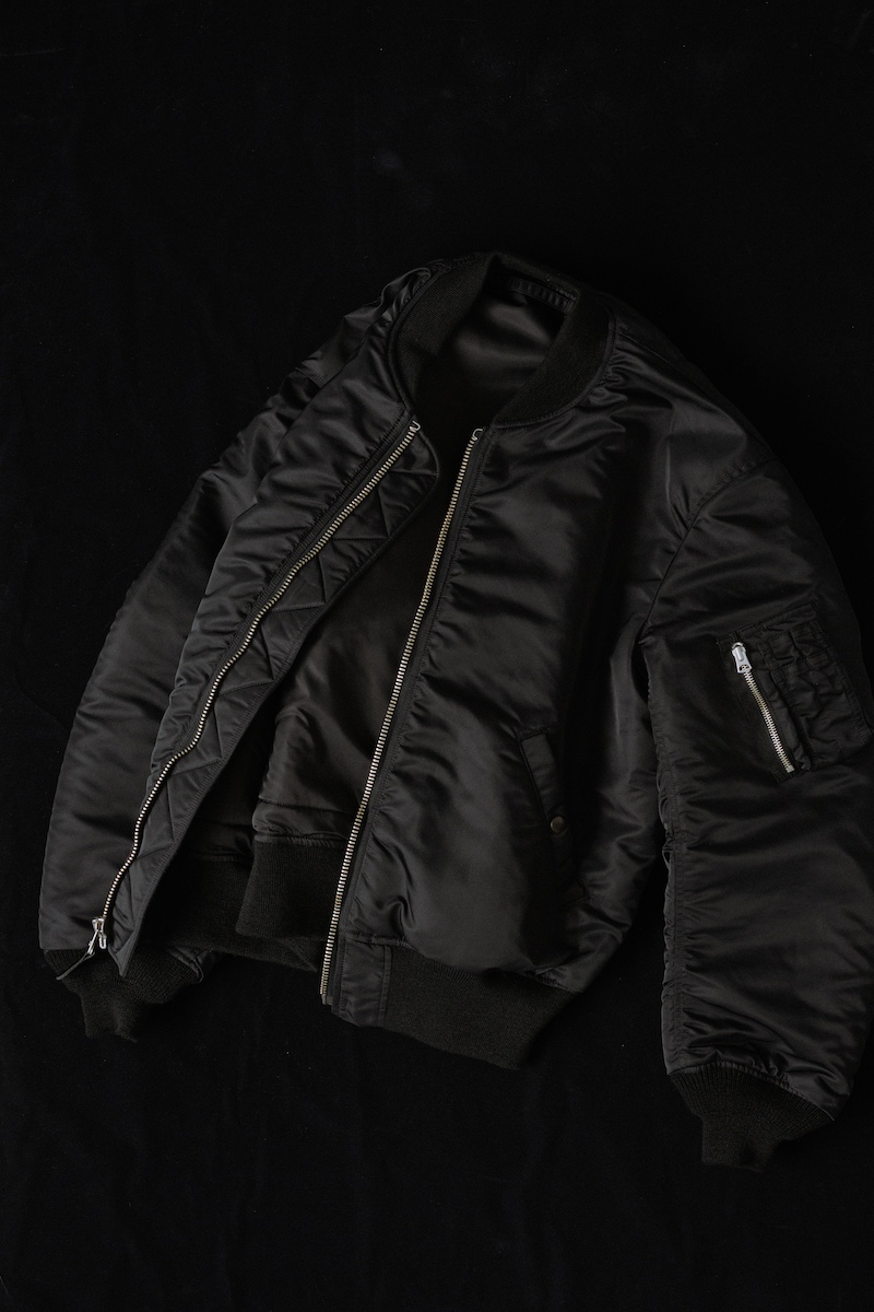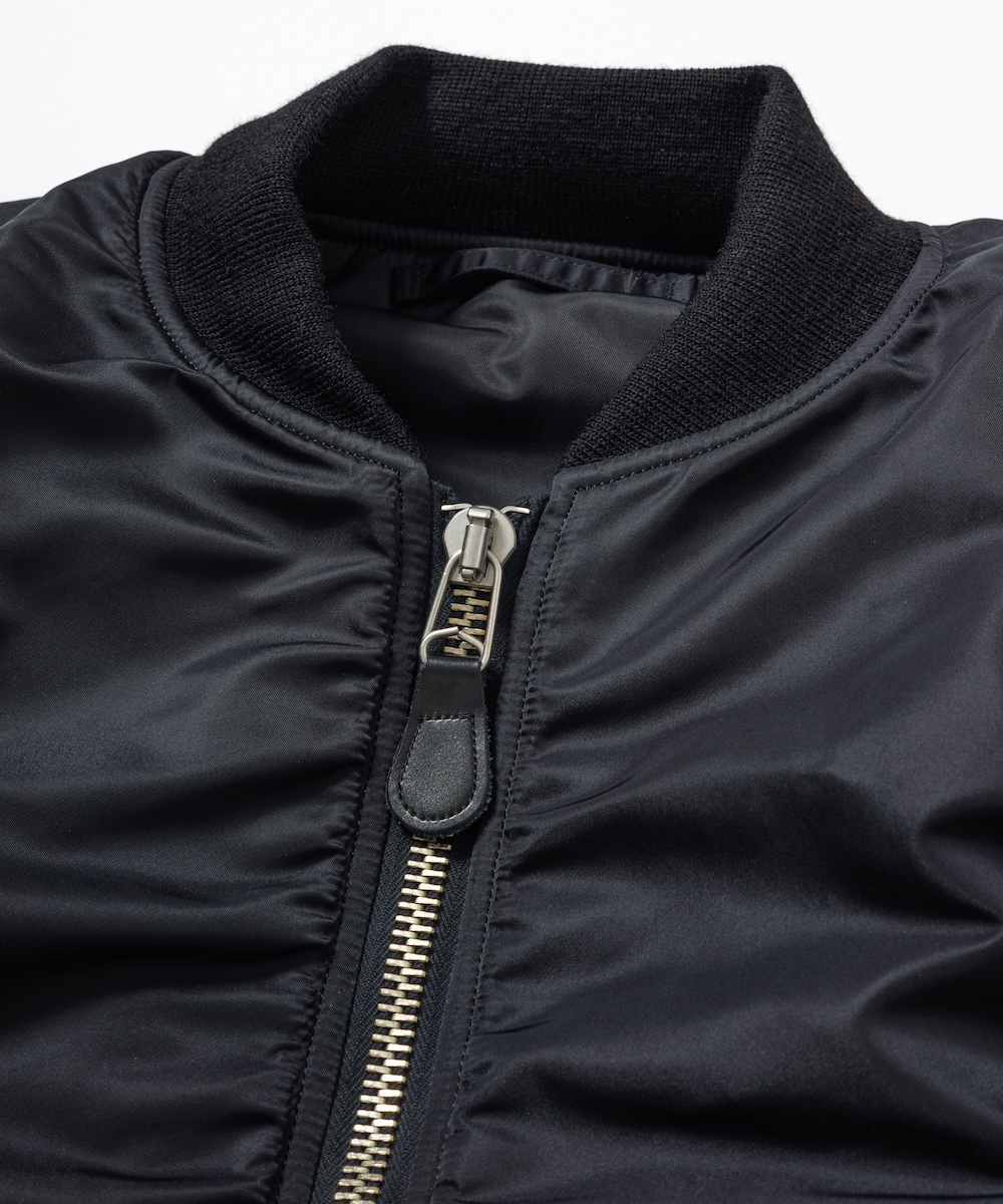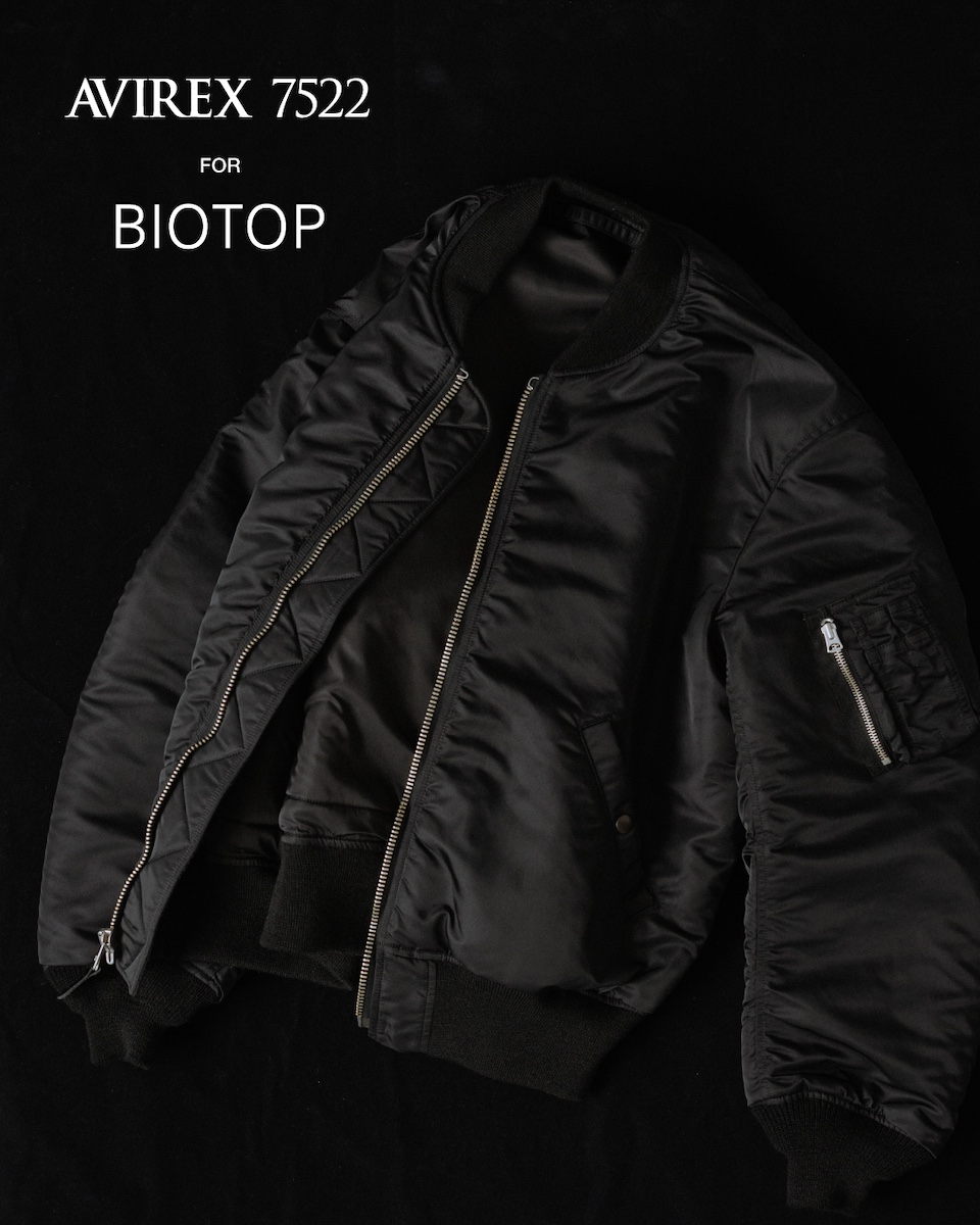 今回別注したのは、“アヴィレックス7522”の中でも高い人気を誇るMA-1。1953〜60年に製作されていたMA-1をベースにアップデートしたモデルで、程よくボリュームのあるシルエットと、着丈の短いボックスシルエットが特徴だ。カラーは、インラインでは24年秋冬シーズンから初登場したブラックを採用。インラインモデルでは真鍮のゴールドジップを使用しているのに対し、別注モデルではアルミのシルバージップに変更し、ブラックボディーとのコントラストで、よりクリーンでモダンな印象に仕上げた。ジップカラーのみを変更するシンプルなアプローチながら、MA-1本来の表情を大きく変え、「ビオトープ」らしい洗練された佇まいを実現している。