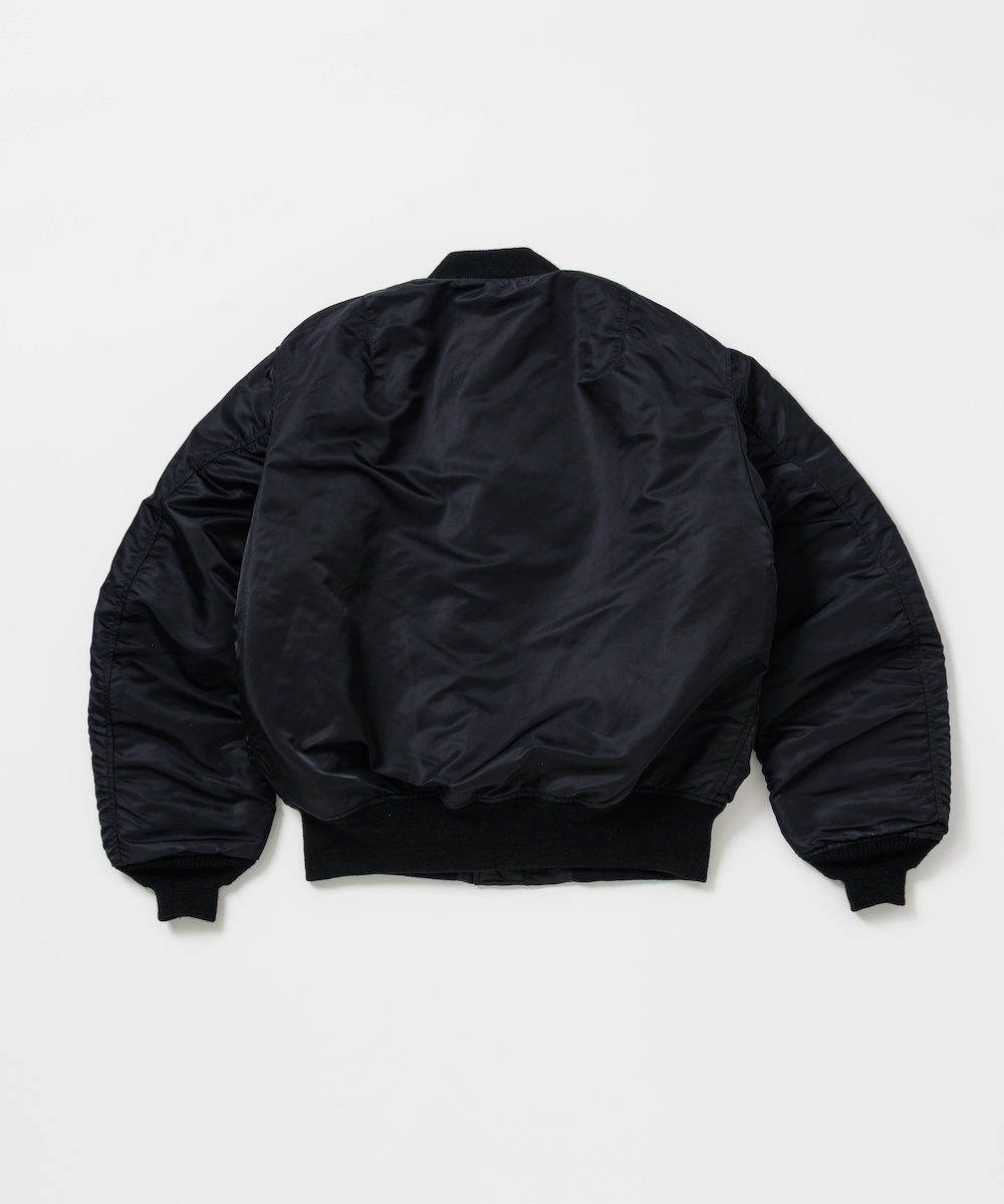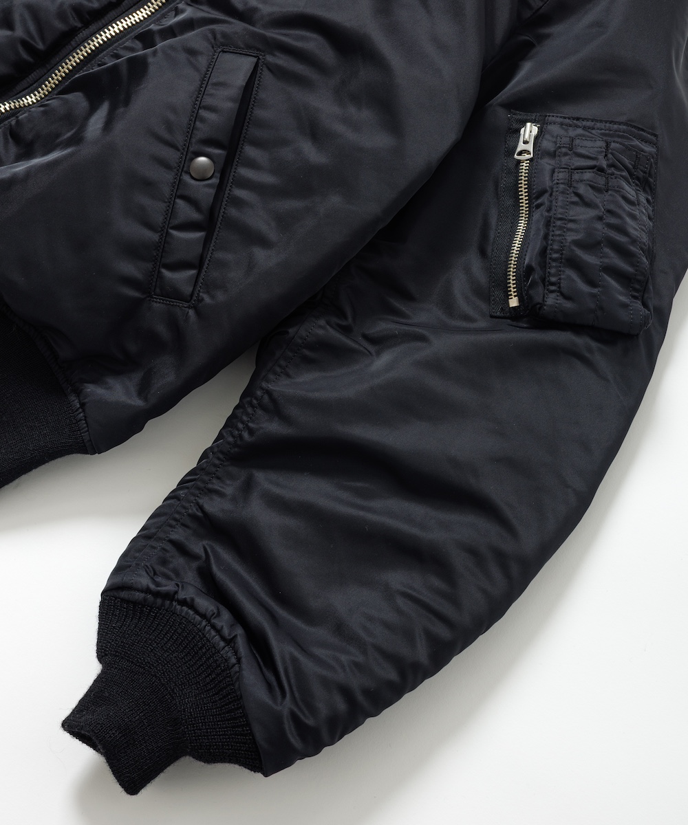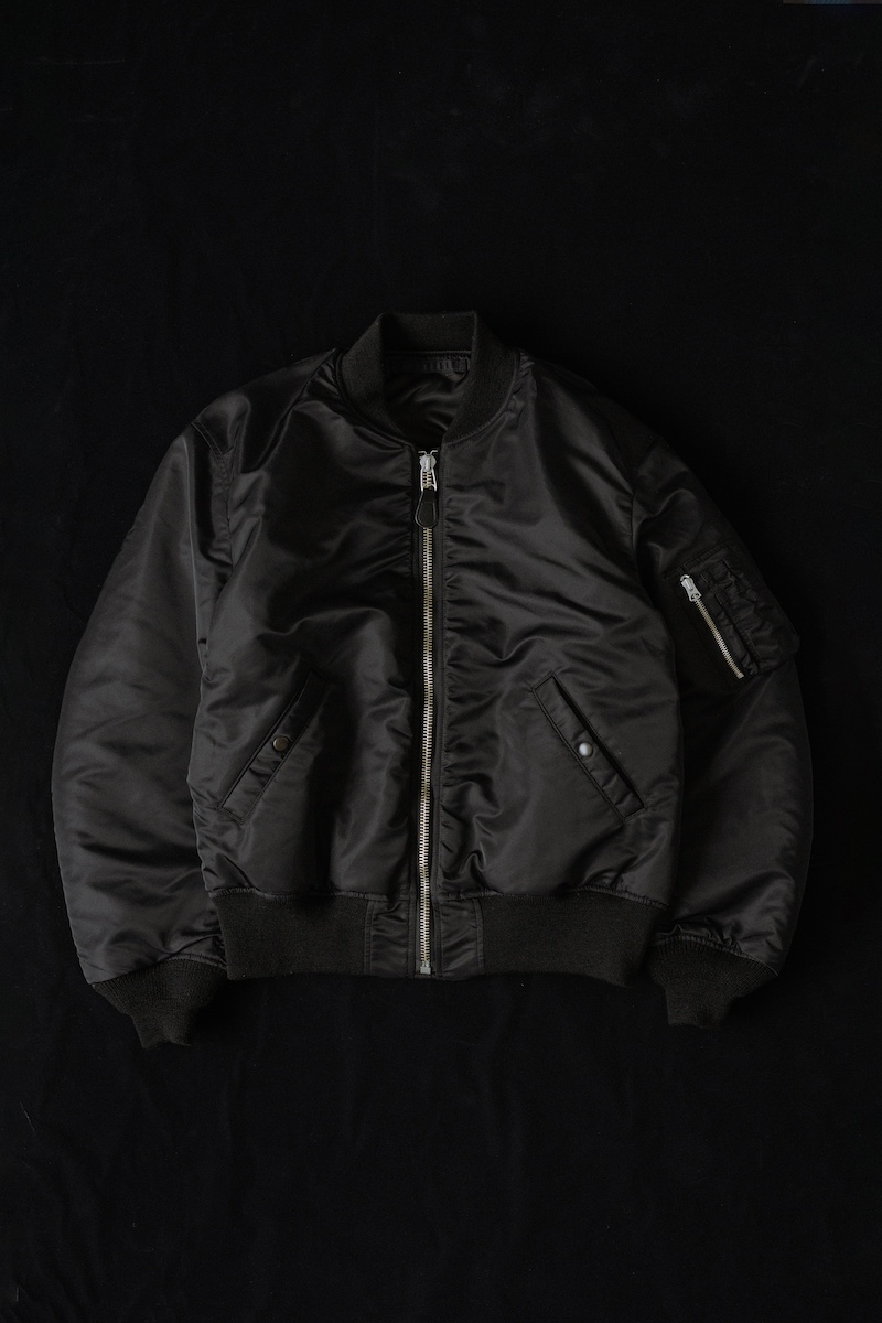 今回別注したのは、“アヴィレックス7522”の中でも高い人気を誇るMA-1。1953〜60年に製作されていたMA-1をベースにアップデートしたモデルで、程よくボリュームのあるシルエットと、着丈の短いボックスシルエットが特徴だ。カラーは、インラインでは24年秋冬シーズンから初登場したブラックを採用。インラインモデルでは真鍮のゴールドジップを使用しているのに対し、別注モデルではアルミのシルバージップに変更し、ブラックボディーとのコントラストで、よりクリーンでモダンな印象に仕上げた。ジップカラーのみを変更するシンプルなアプローチながら、MA-1本来の表情を大きく変え、「ビオトープ」らしい洗練された佇まいを実現している。