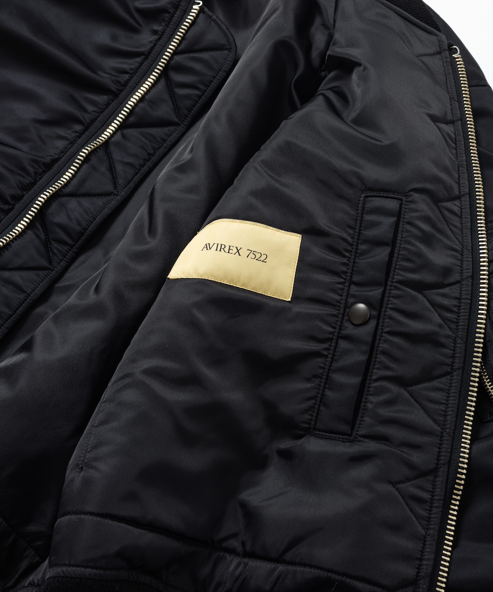 素材には、ビンテージレプリカに定評のあるブランドが採用する「66ナイロン」を使用。中綿にはリサイクル素材やウールモッサの端材をパイル状にした特殊素材を用い、袖リブには国内でも限られた台数しか稼働していない織機で編み立てたウール100%のチューブリブを採用した。また、「アヴィレックス7522」の全アイテムに付属するドッグタグネックレスも同梱される。