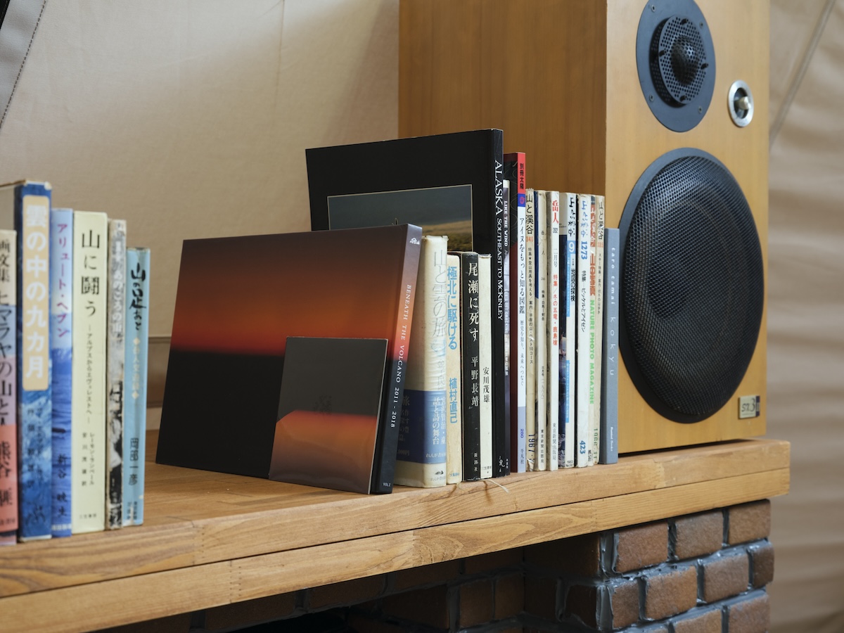 向かい側のテント「マウンテン ラウンジ(MOUNTAIN LOUNGE)」は、バックカントリーを終えた後に立ち寄るためのラウンジスペースだ。心地良い音楽が流れる中、疲れた体を休めながら、ゆったりと過ごすことができる。スペース内のライブラリーには、「アークテリクス」がコレクションする山やトレイルに関する書籍がそろい、ニセコの自然や山岳文化への理解を深められる。また、ニセコ周辺のトレイルを紹介するマップも展示し、滞在そのものが学びのひとときとなる設えだ。