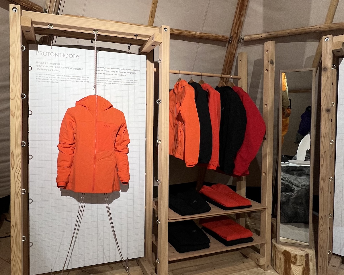 会場は「ニセコ東急 グラン・ヒラフ」スキー場の麓に位置し、山小屋を思わせる2つのテントが並ぶ。左手の「パフォーマンス ラボ(PERFORMANCE LAB)」は、プロダクトを試せる体験型展示スペースだ。バックカントリー向けに設計した“ラッシュ ジャケット”“ラッシュ ビブ パンツ”に加え、ミッドレイヤーの中核を担う“プロトン フーディー”“アトム フーディー”の計4型をラインアップ。“システム オブ ドレス”を解説したパネルも展示する。