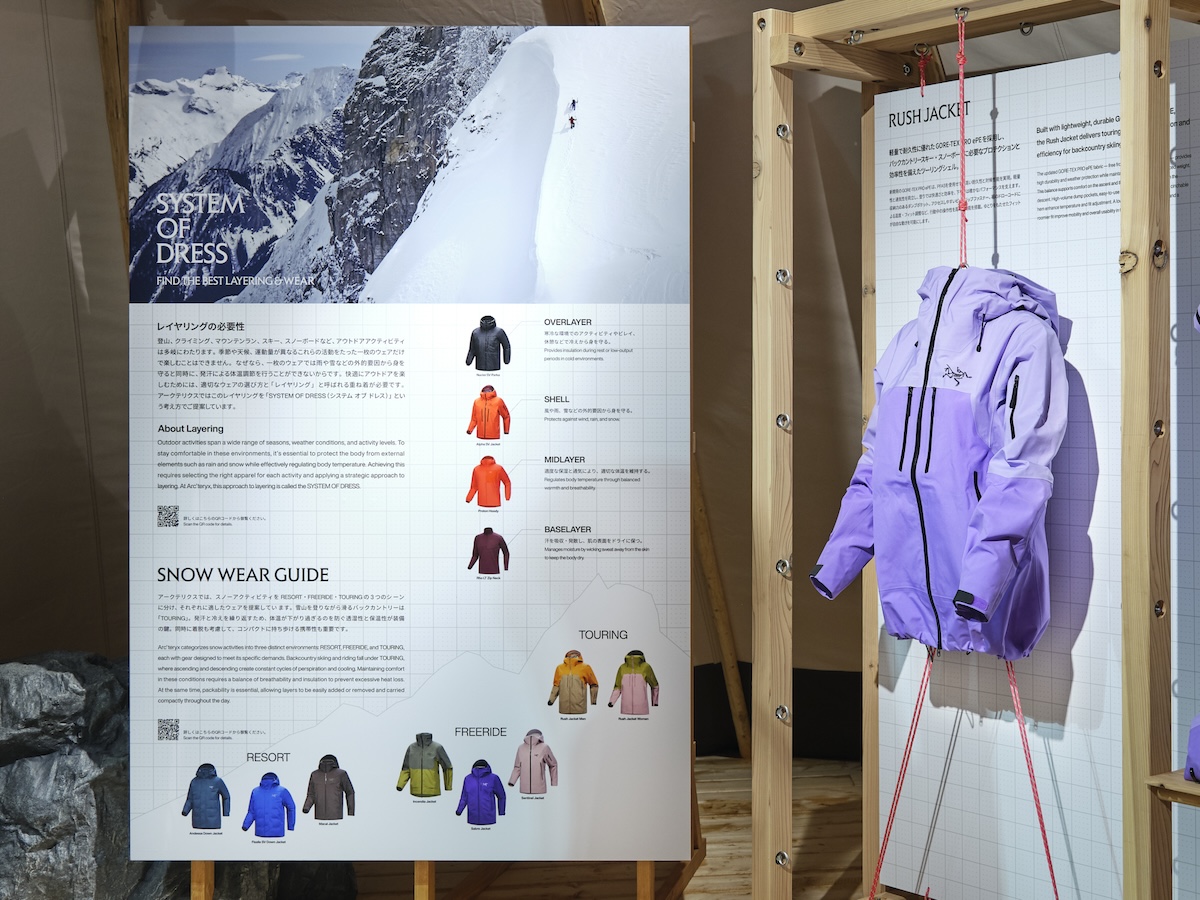 「アークテリクス」は近年、ファッションアイテムとしての注目も高いが、そのルーツは1989年にカナダ・バンクーバーで誕生したアウトドアブランドにある。山岳地帯で培った開発思想を背景に、クライミングやスキー、バックカントリーといった本格的な山岳アクティビティー向けプロダクトで、機能性とクラフツマンシップを追求してきた。そうした知見を生かして提唱するのが、レイヤリング理論 “システム オブ ドレス(System of Dress)”だ。ポップアップでは、この思想を知識と実体験を交えながら理解できる構成としている。