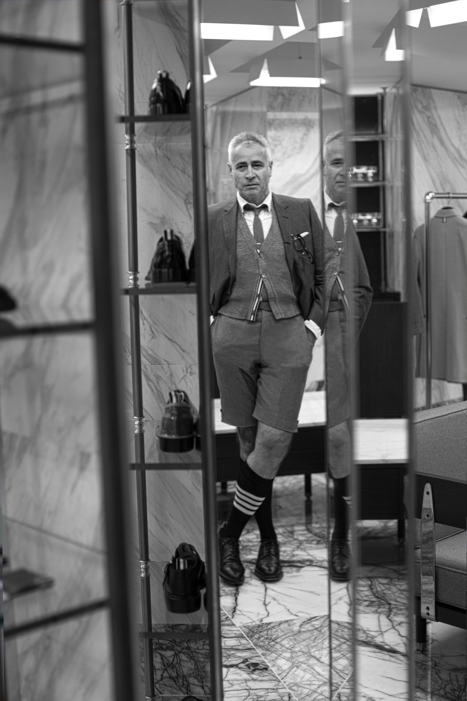 その出自は、2001年にニューヨークで開店したメイド・トゥー・メジャーのスーツ店にある。2004年にレディ・トゥ・ウエアのコレクションをスタートすると、アメリカントラディショナルを基盤にしながら、着丈や袖丈を極端に短くした“シュランケン・スーツ”、くるぶし丈のパンツ、グレーフランネル素材といった、テーラリングの既成概念を覆すアイコニックなスタイルを次々に打ち出した。一躍脚光を浴びたトム・ブラウンは、その後20年以上にわたり、米国ファッションの前線をけん引し続けている。