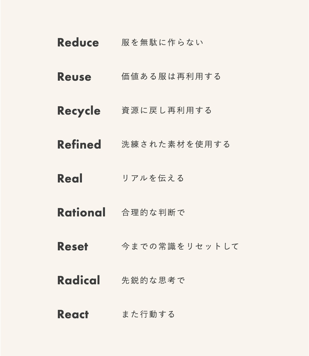 「ナインアール」は、「ファッションが生み出す優劣をなくす」ことをミッションに掲げるブランド。Refined、Real、Rational、Reset、Radical、Reactなど、“R”を頭文字とする9つの価値観を中核に、流行に左右されない衣服づくりを行っている。