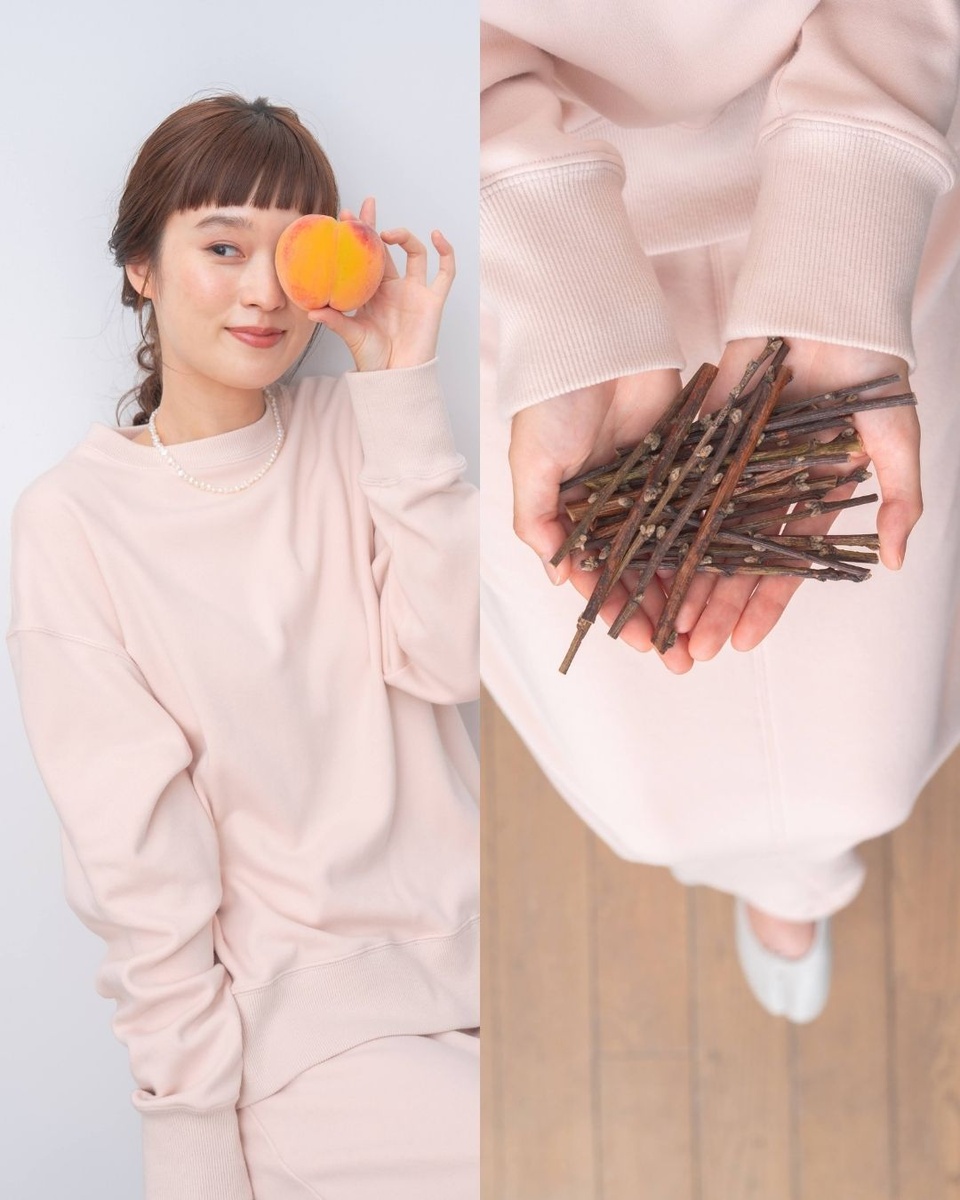 同プロジェクトではこれまで、22年にメロンの皮、23年に桃の剪定枝を染料に用いたスウェットを発表してきた。第3弾となる今回は、果樹栽培の現場で日常的に発生するみかんの果皮と枝葉に焦点を当てた。